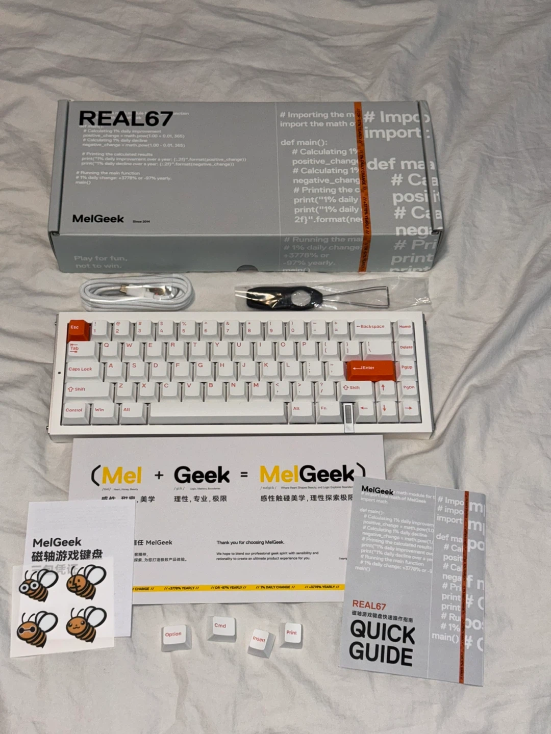 This is the MelGeek REAL67 wired keyboard in the Sodium-White colour. It features special magnetic switches (TTC tai’e sword switches), rapid trigger, and hot-swappable capabilities. Includes original box and all accessories.