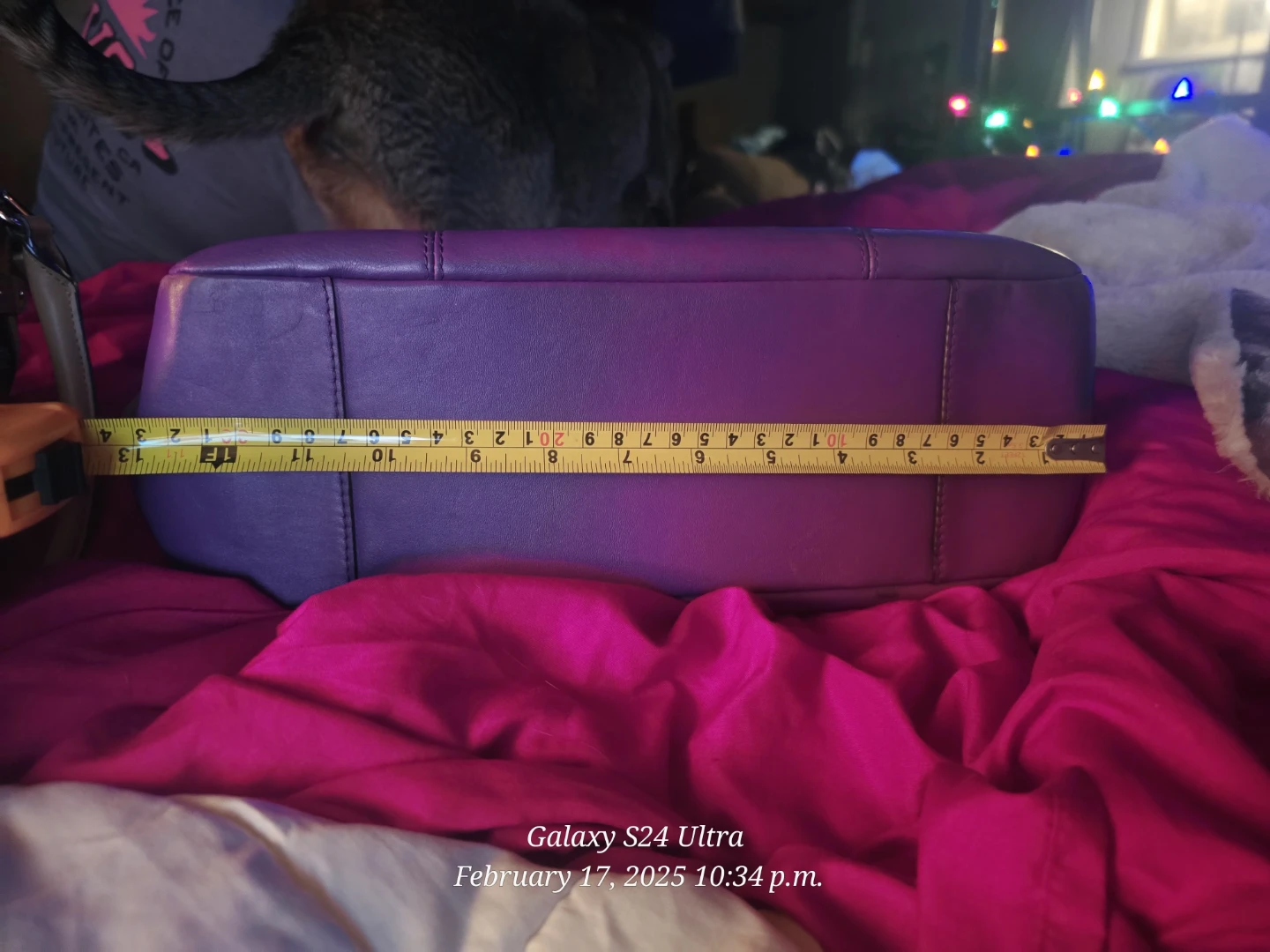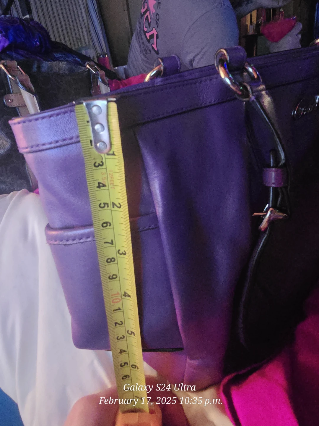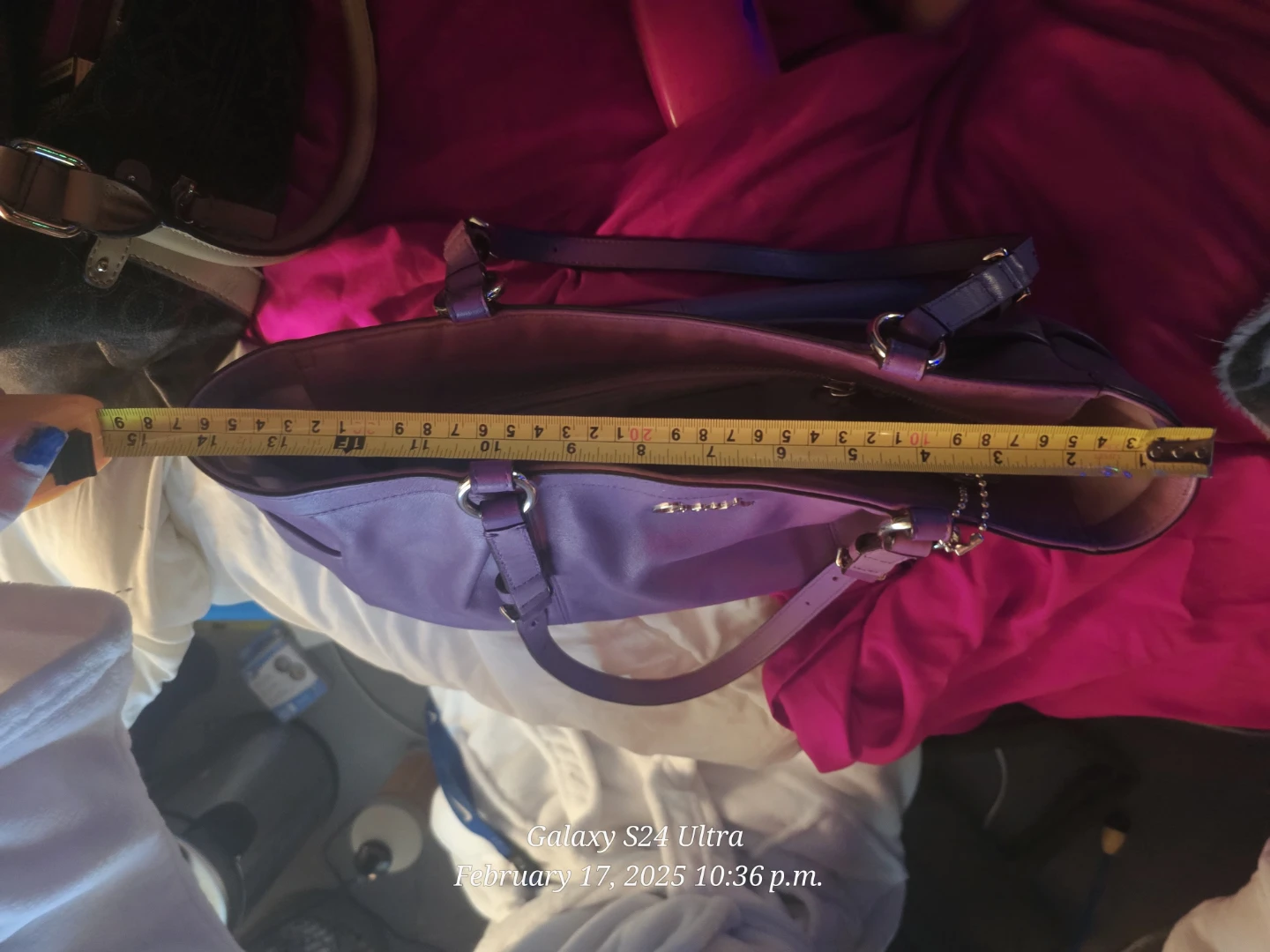 Beautiful Purple leather Coach handbag. The bag measures approximately 13 inches across at the widest point and 7 inches from top to bottom. It's made of genuine leather.
