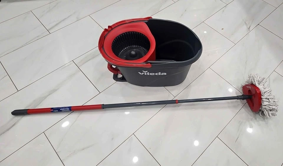 Selling Vileda spin mop with bucket in good working condition. Features a foot pedal spin system for easy wringing. It's lightweight and easy to use, working great for tile, laminate, and hardwood floors. Clean and works properly. Perfect for everyday cleaning.