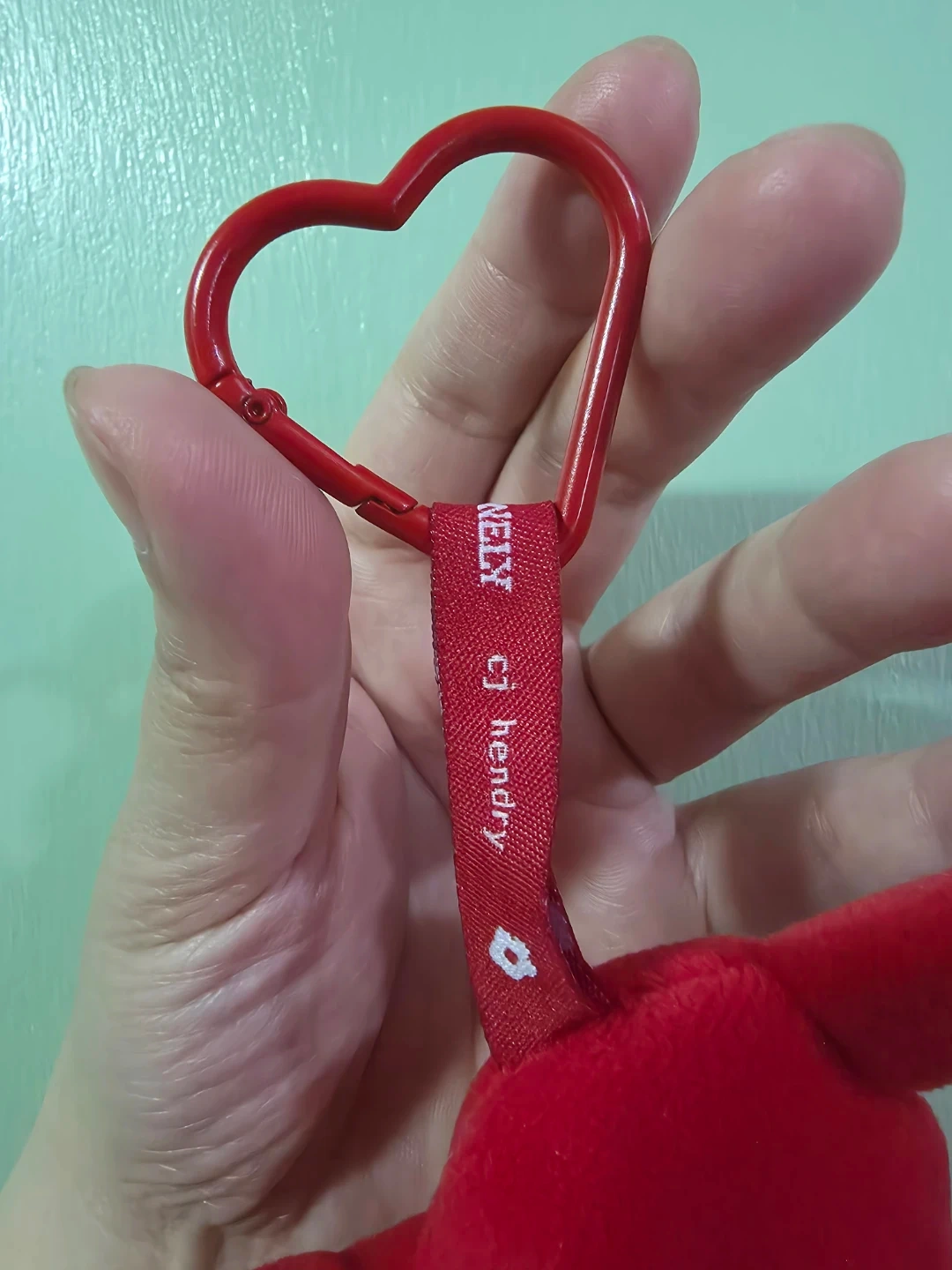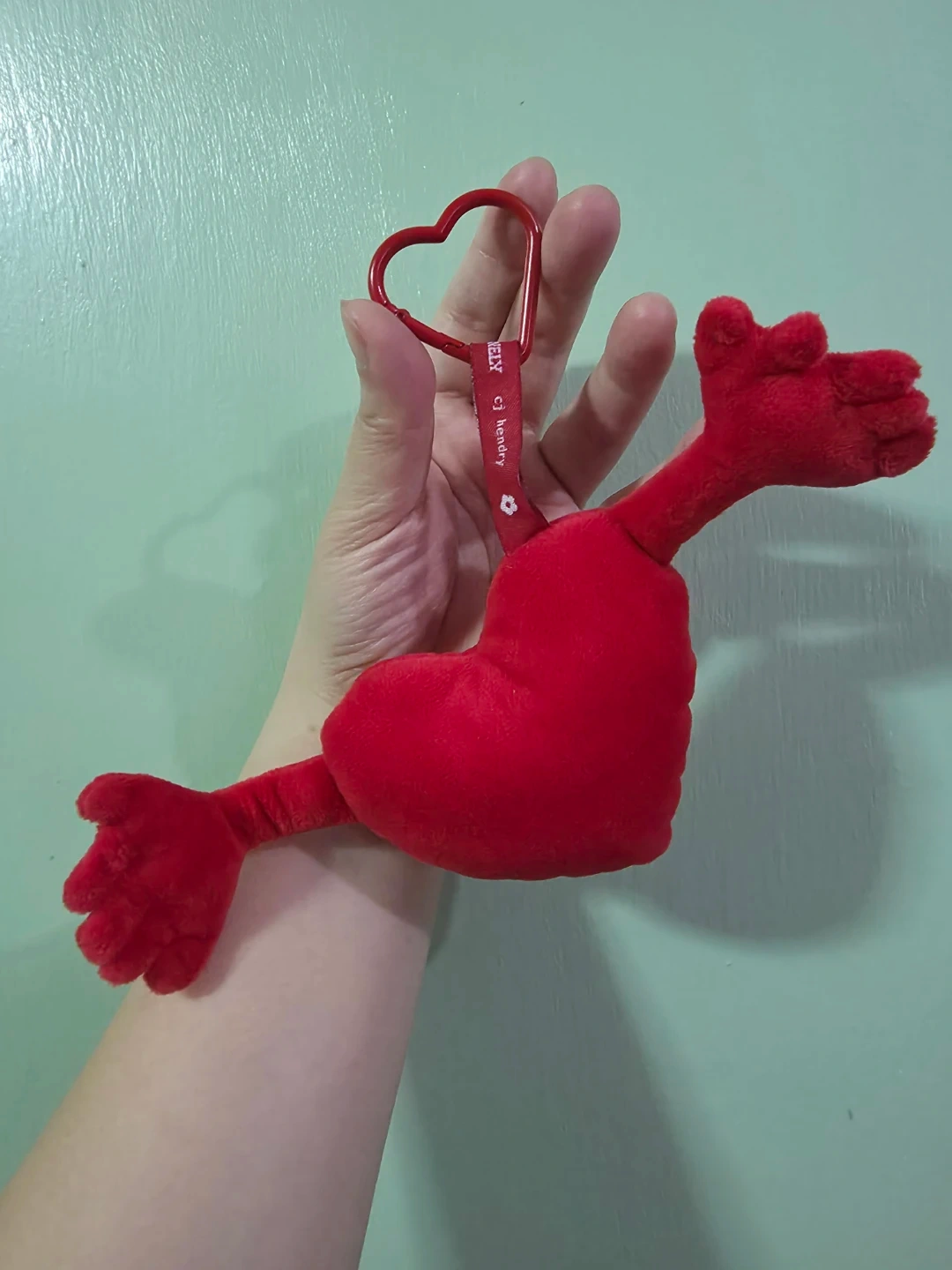 CJ Hendry x Tony's Chocolonely Collaboration Limited Edition Keychain. It's a red heart plush keychain with arms. It features a red heart-shaped carabiner clip. Soft plush material.