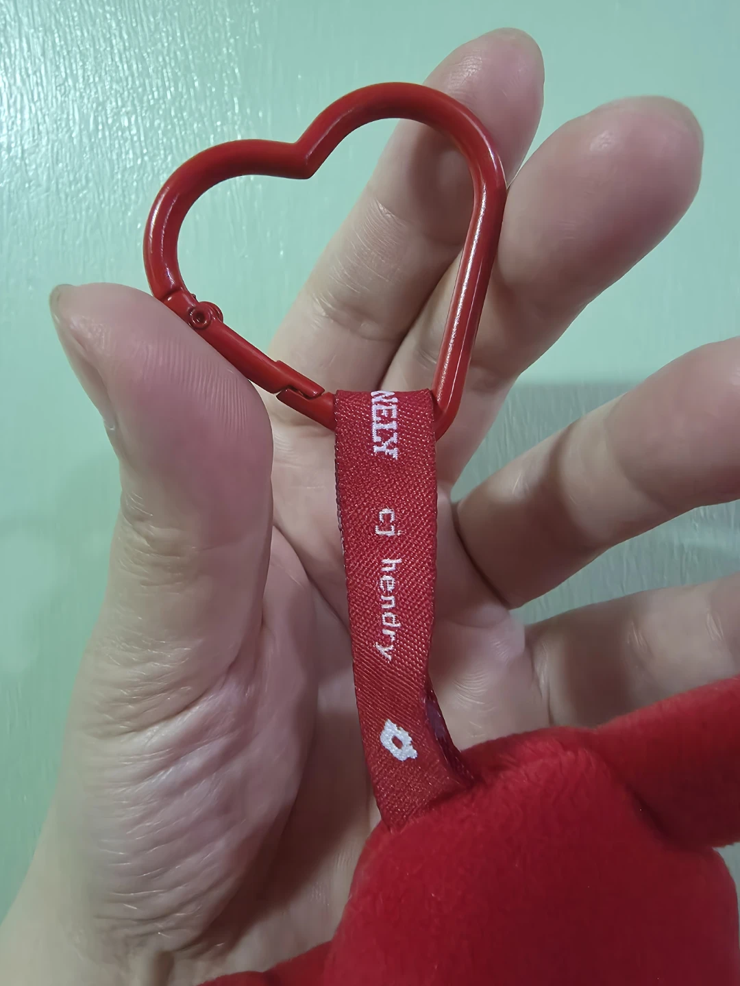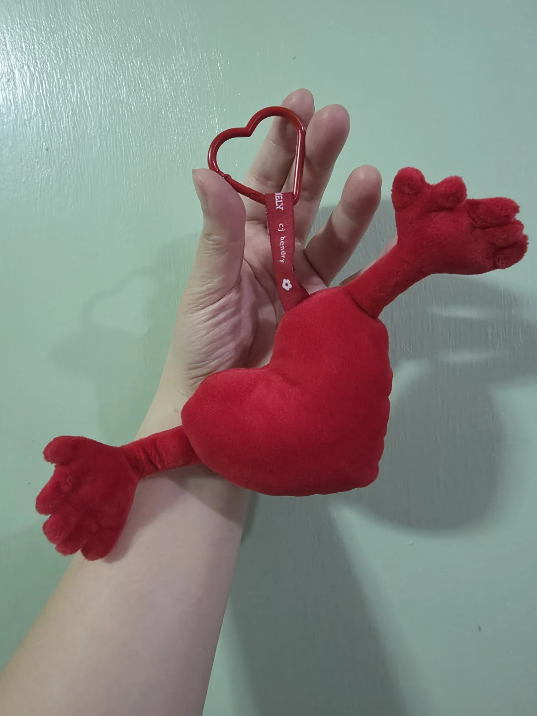 CJ Hendry x Tony's Chocolonely Collaboration Limited Edition Keychain. It's a red heart plush keychain with arms. It features a red heart-shaped carabiner clip. Soft plush material.