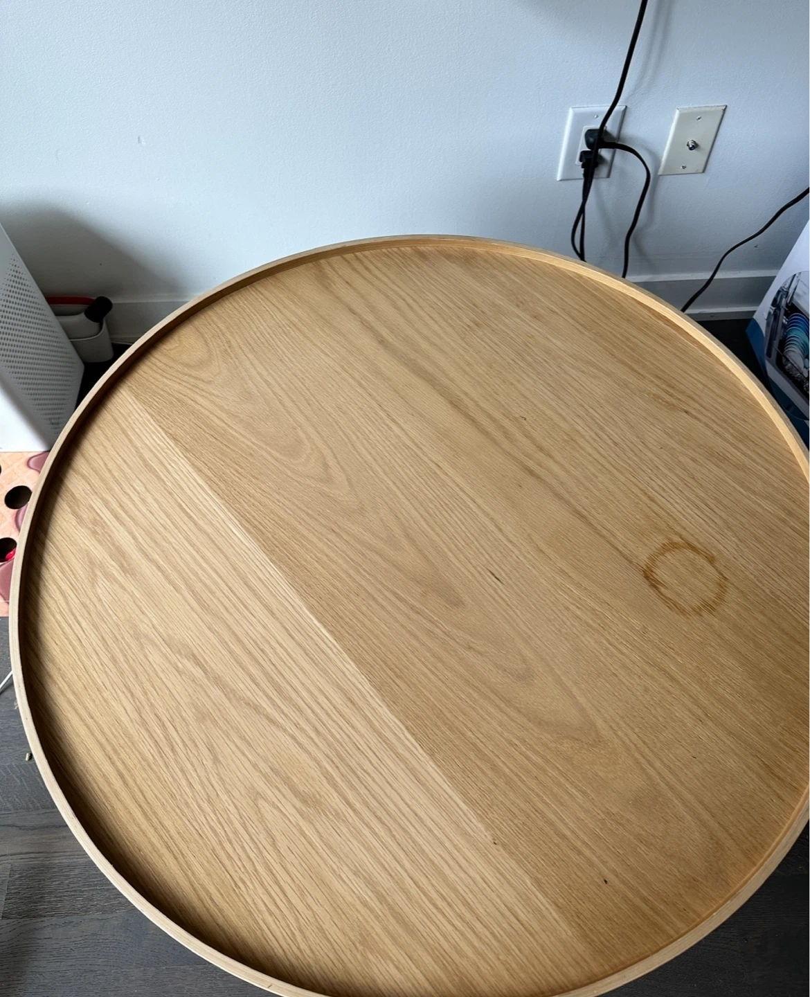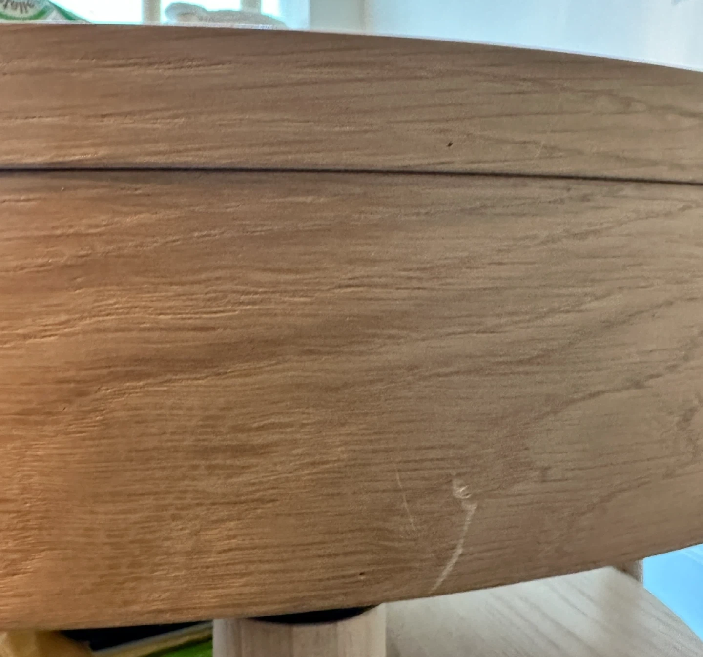 Small scuffs on the side and a stain on top but can be easily removed by using a wood stain.