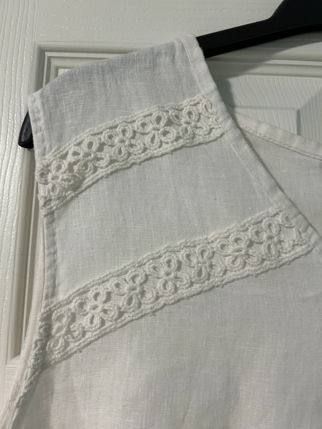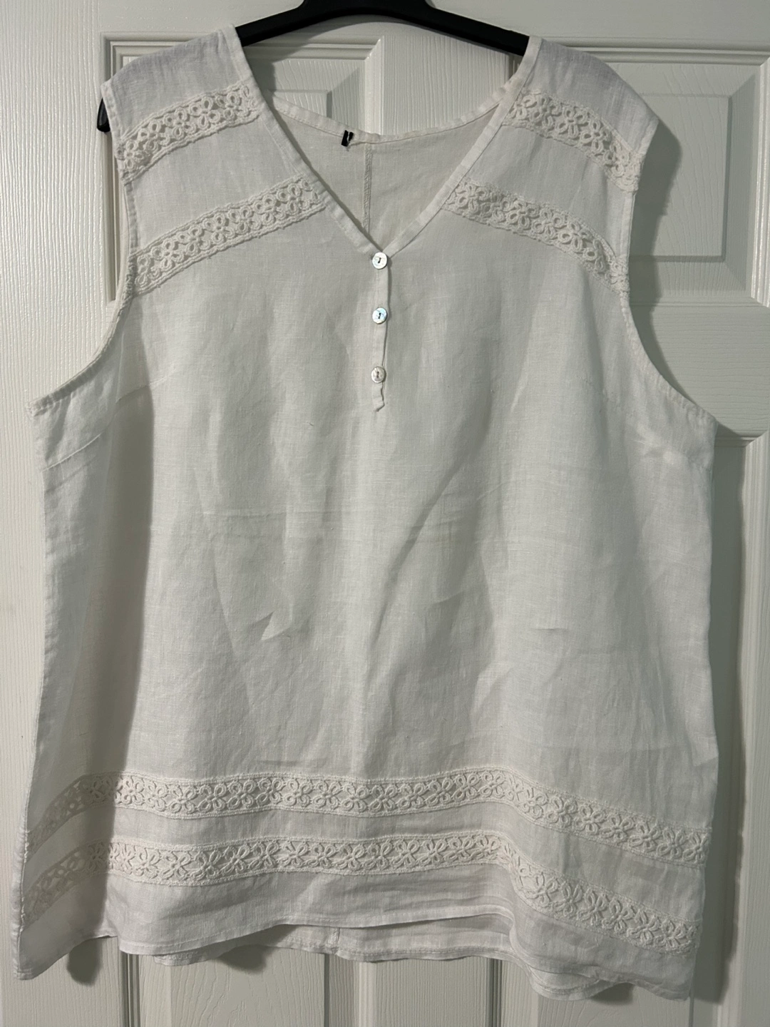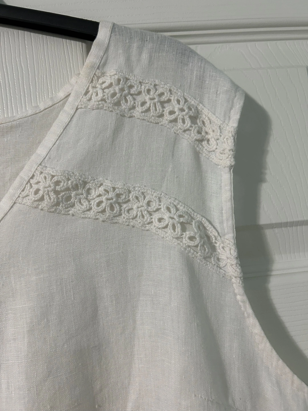Beautiful and classic white linen sleeveless top. Featuring white linen fabric. Has lace detailing around the top and bottom. Great for warm summer days.
