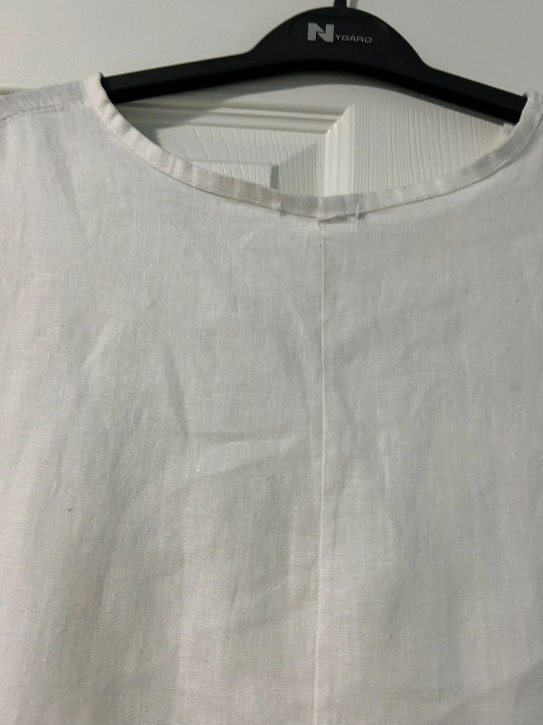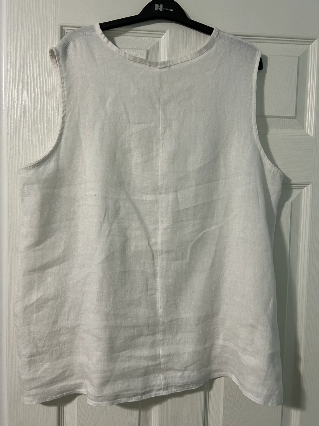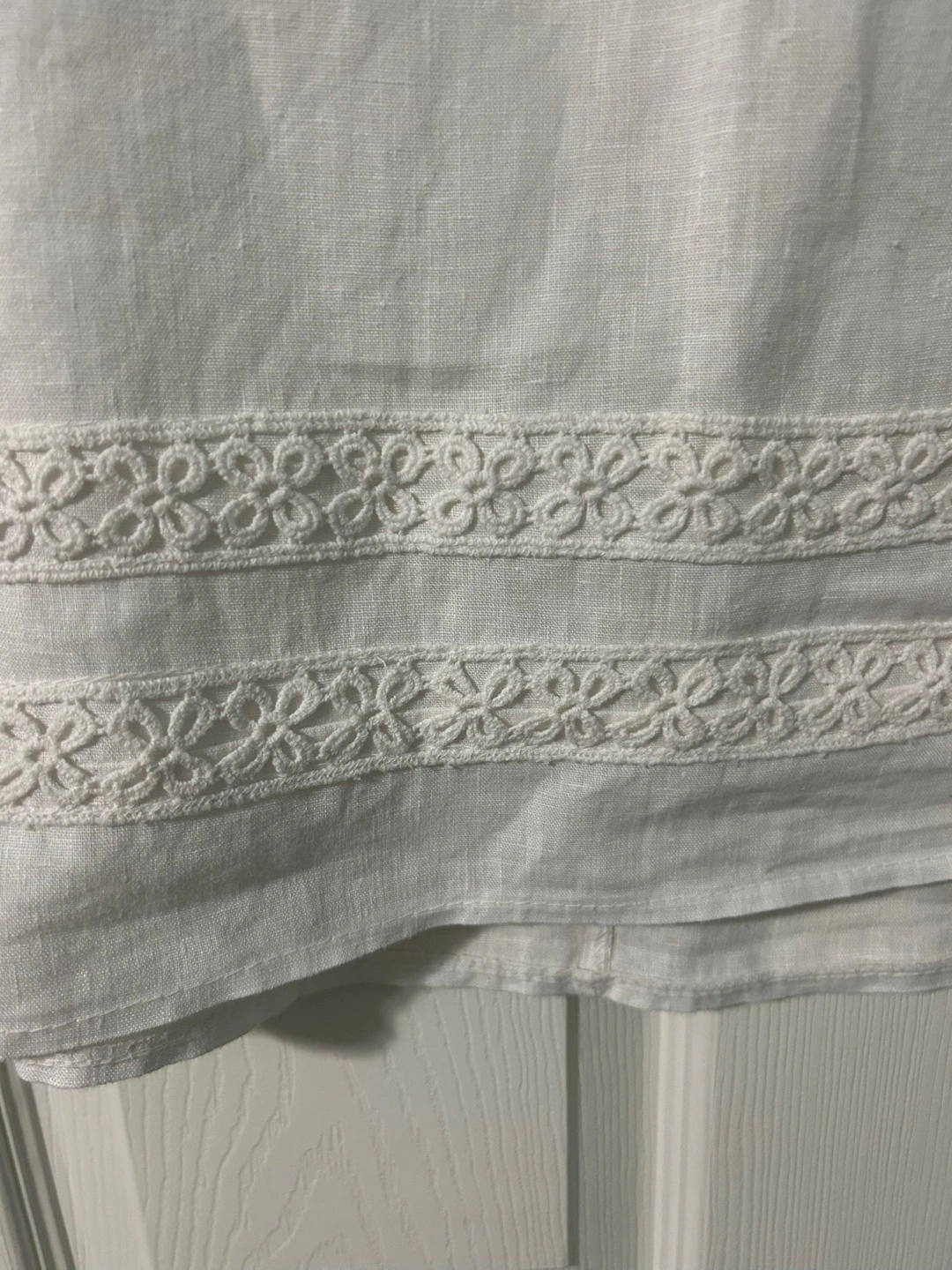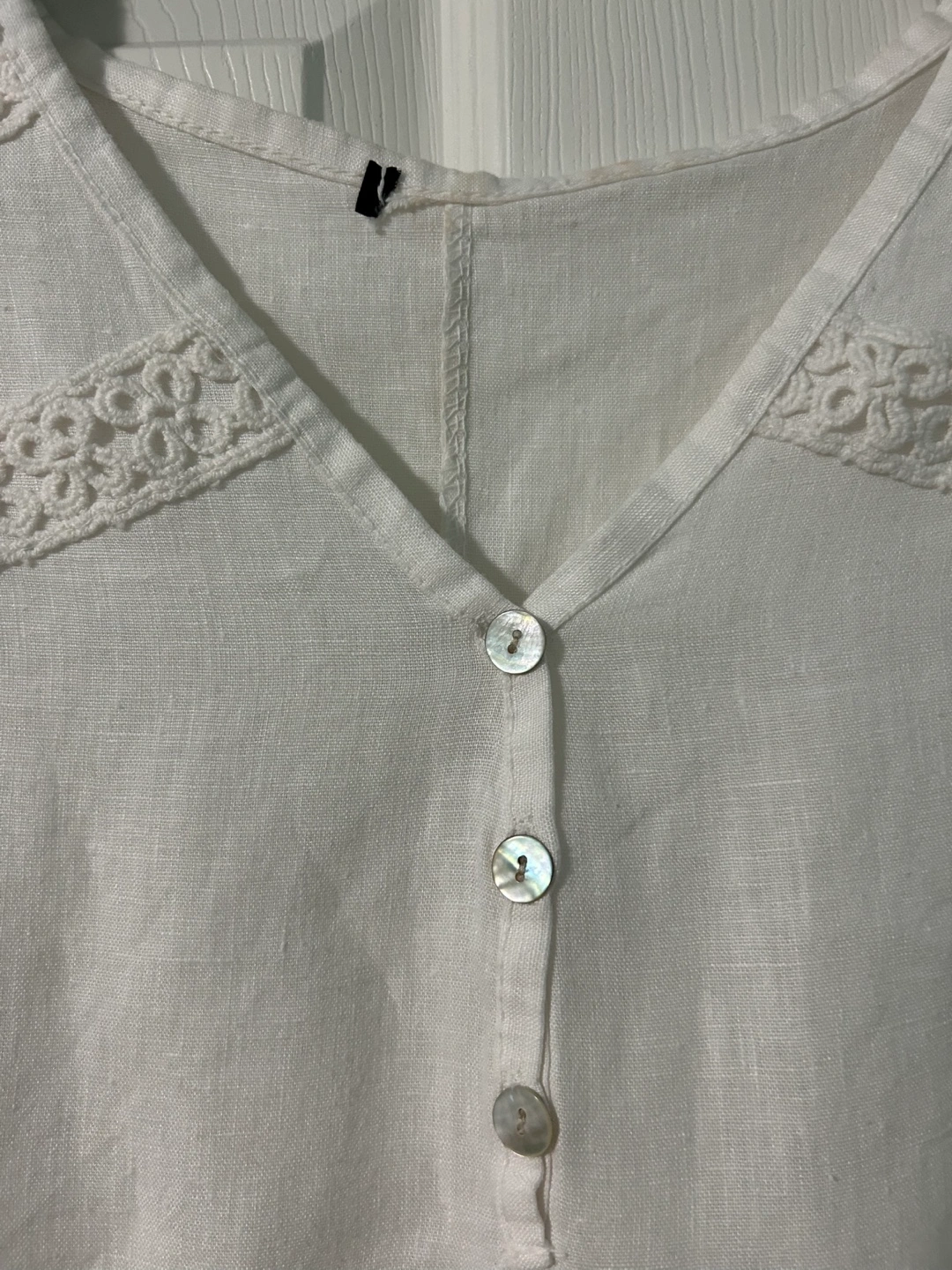 Beautiful and classic white linen sleeveless top. Featuring white linen fabric. Has lace detailing around the top and bottom. Great for warm summer days.