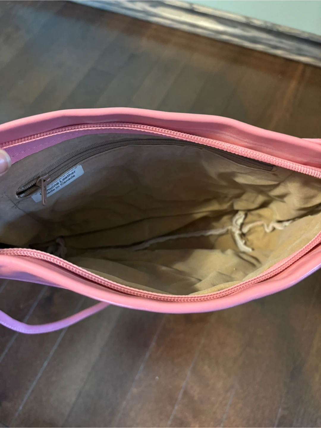 This is a sweet pink clutch or crossbody bag, made from genuine leather right here in Canada. It's got a nice floral detail on the front and a thin adjustable strap. The interior lining looks like a tan fabric.