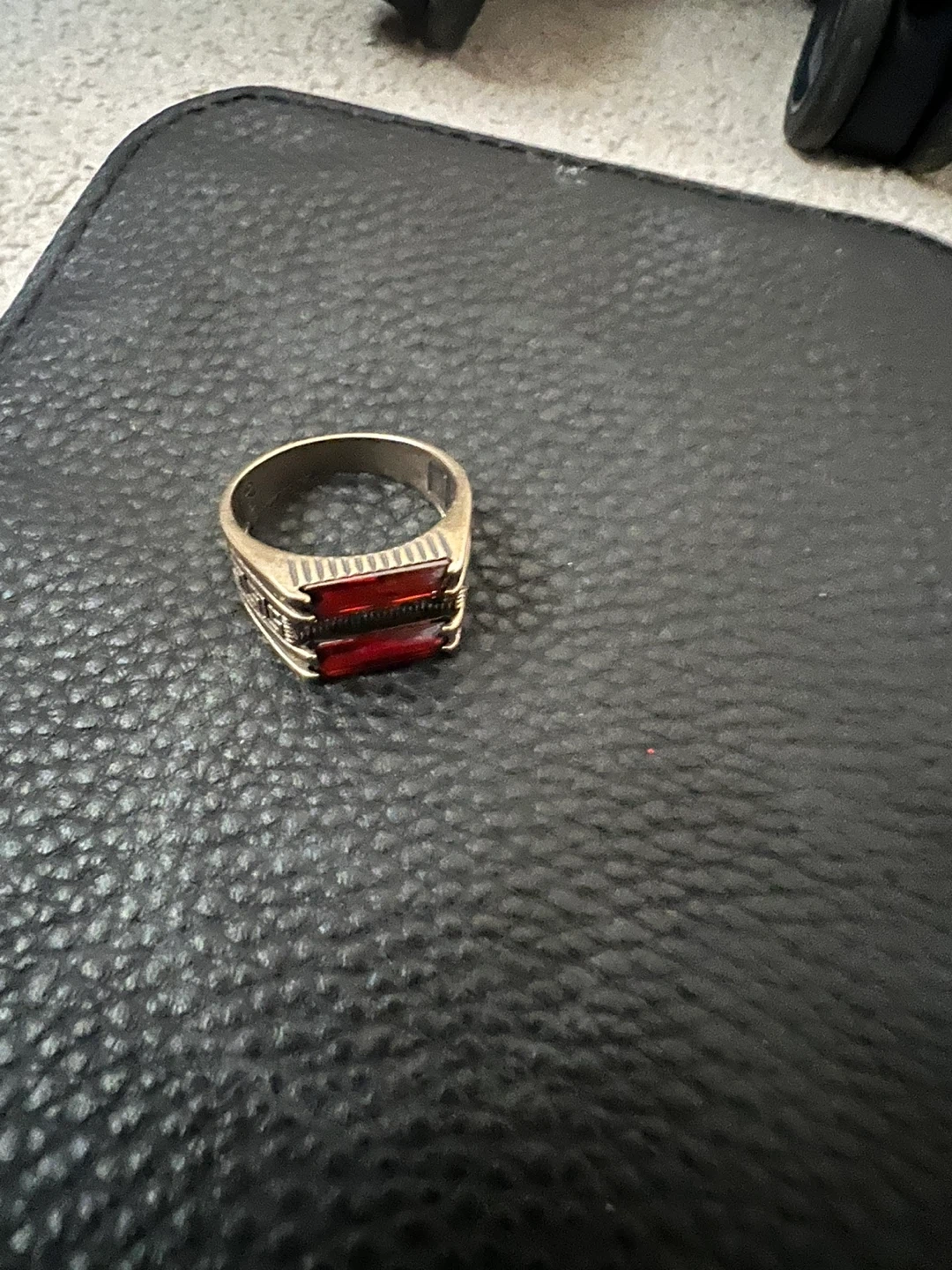A men's ring with a silver-tone band. It features two rectangular red stones set horizontally. The band has a ribbed detail on the sides.