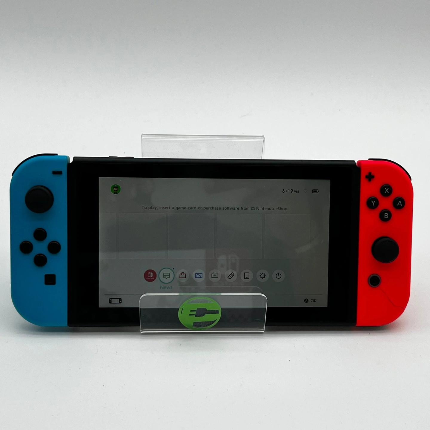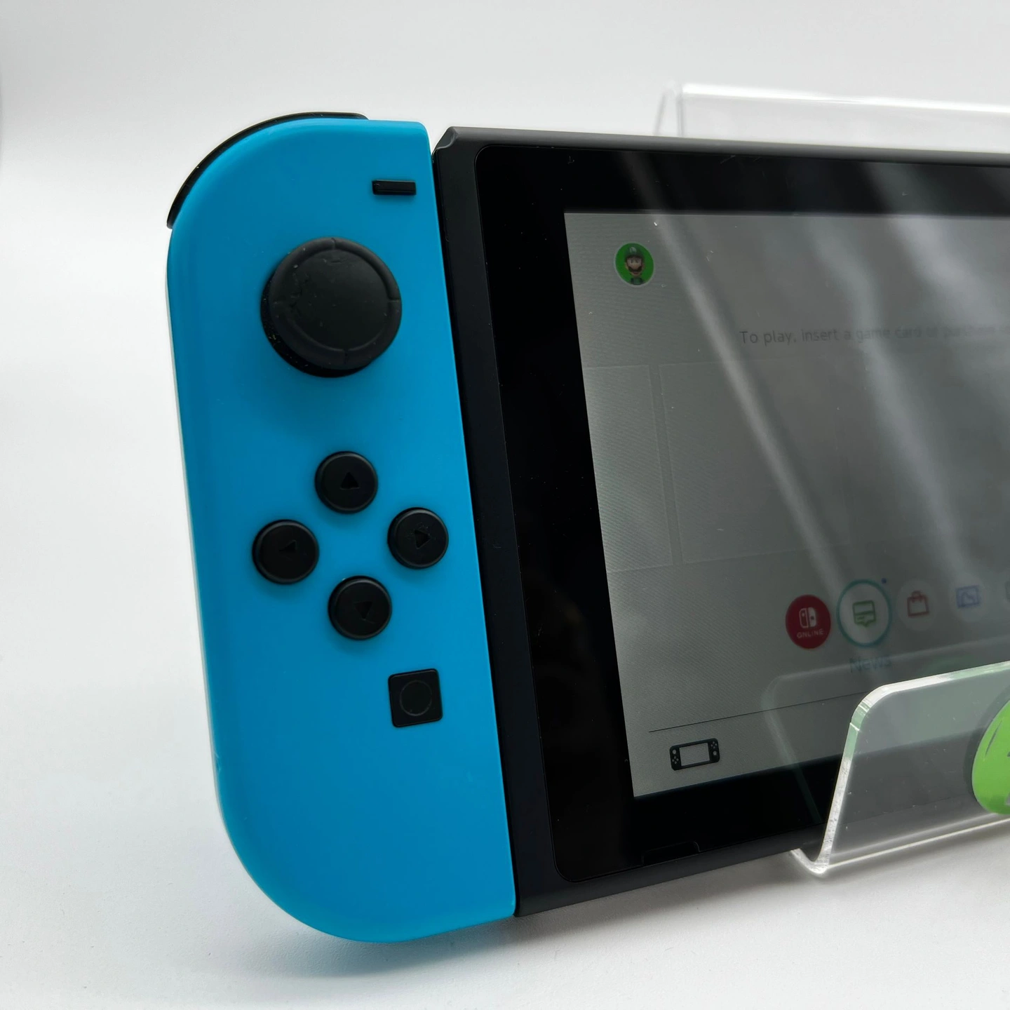 This console is in good cosmetic condition, with minor but noticeable scuffs and wear on the top, bottom, and sides. Please review our close-up photos of the actual item for sale. The cartridge slot and its cover are in good condition and remain intact. Both Joy-Cons work perfectly; however, the red Joy-Con has a crack, while the blue Joy-Con is in good condition. Please view our close up photos, as these are taken of the actual item being offered for sale.