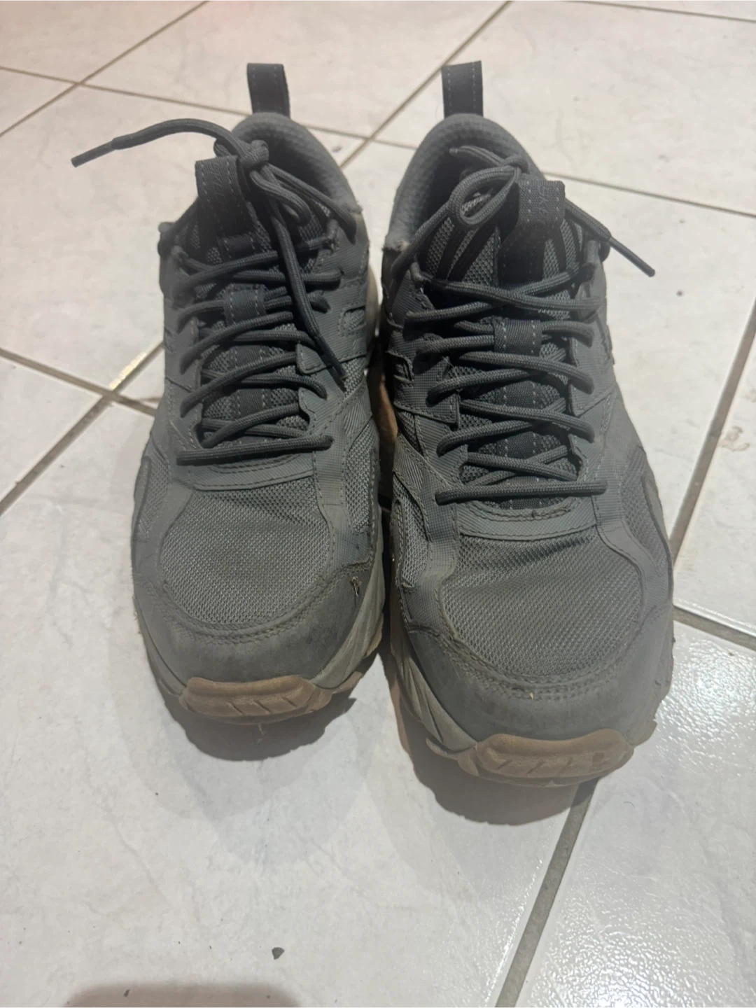 Selling a pair of Goodyear Skechers sneakers in gray. They have a rugged sole. And water repellent