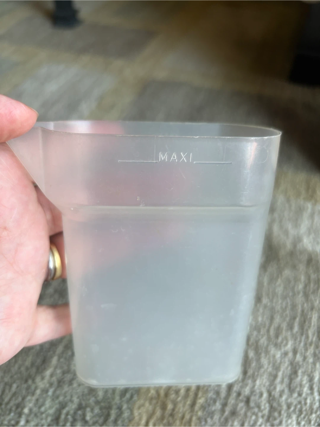 This is a clear plastic measuring cup. It has a MAXI fill line. Great for kitchen use!