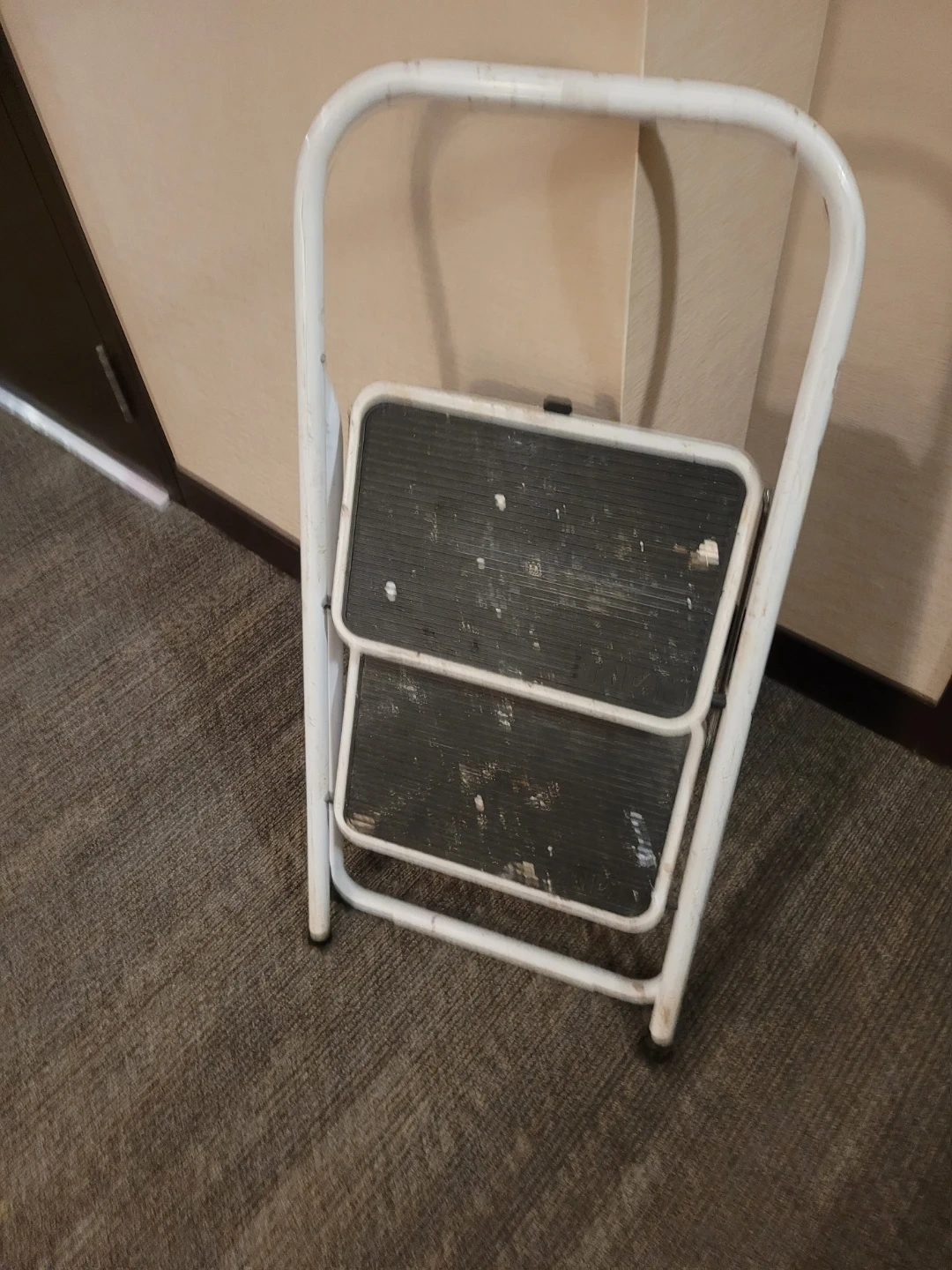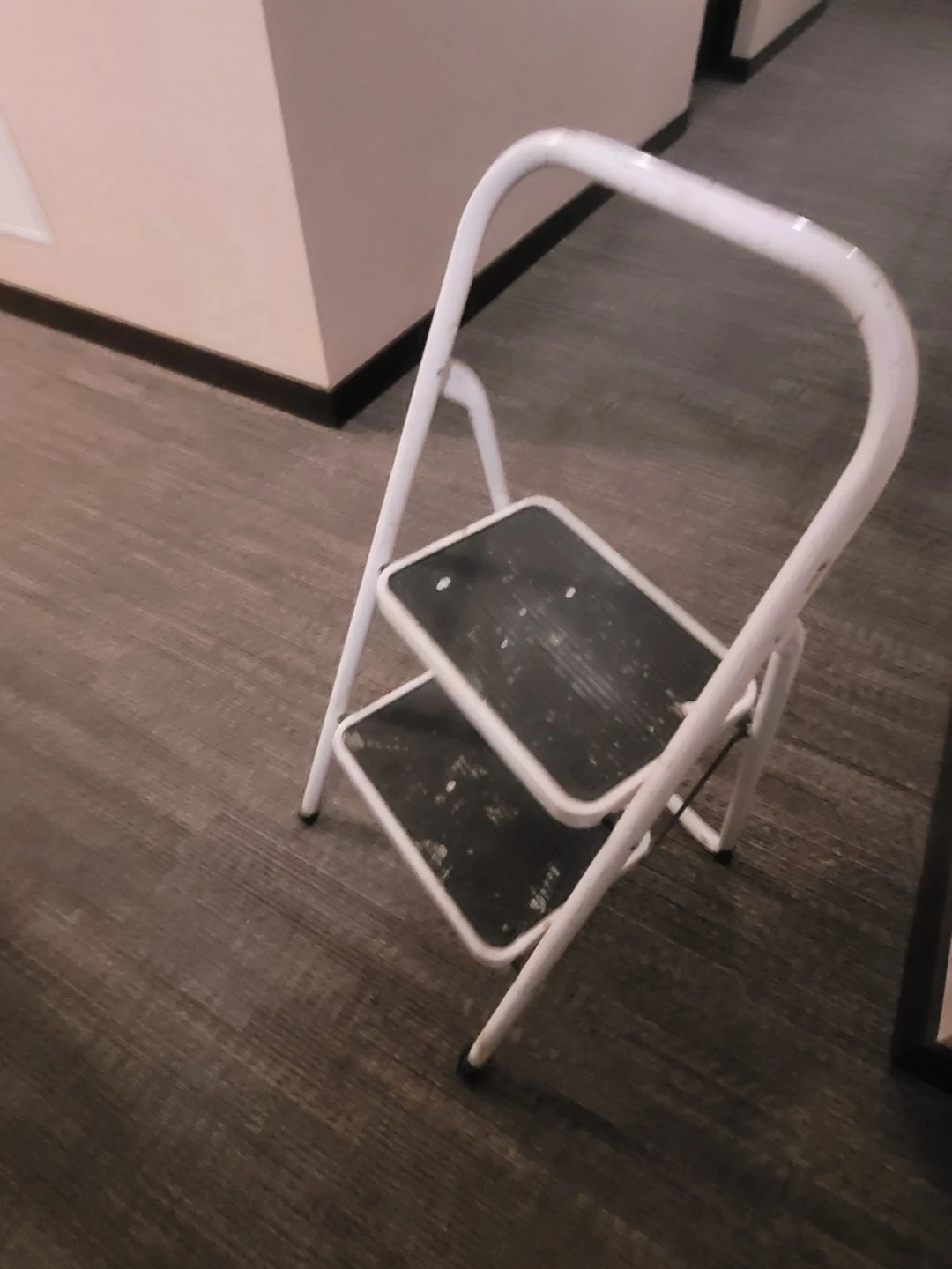 White metal frame with black non-slip treads. This 2-step stool folds flat for easy storage. It's useful for reaching higher shelves or cupboards.It is heavy duty.