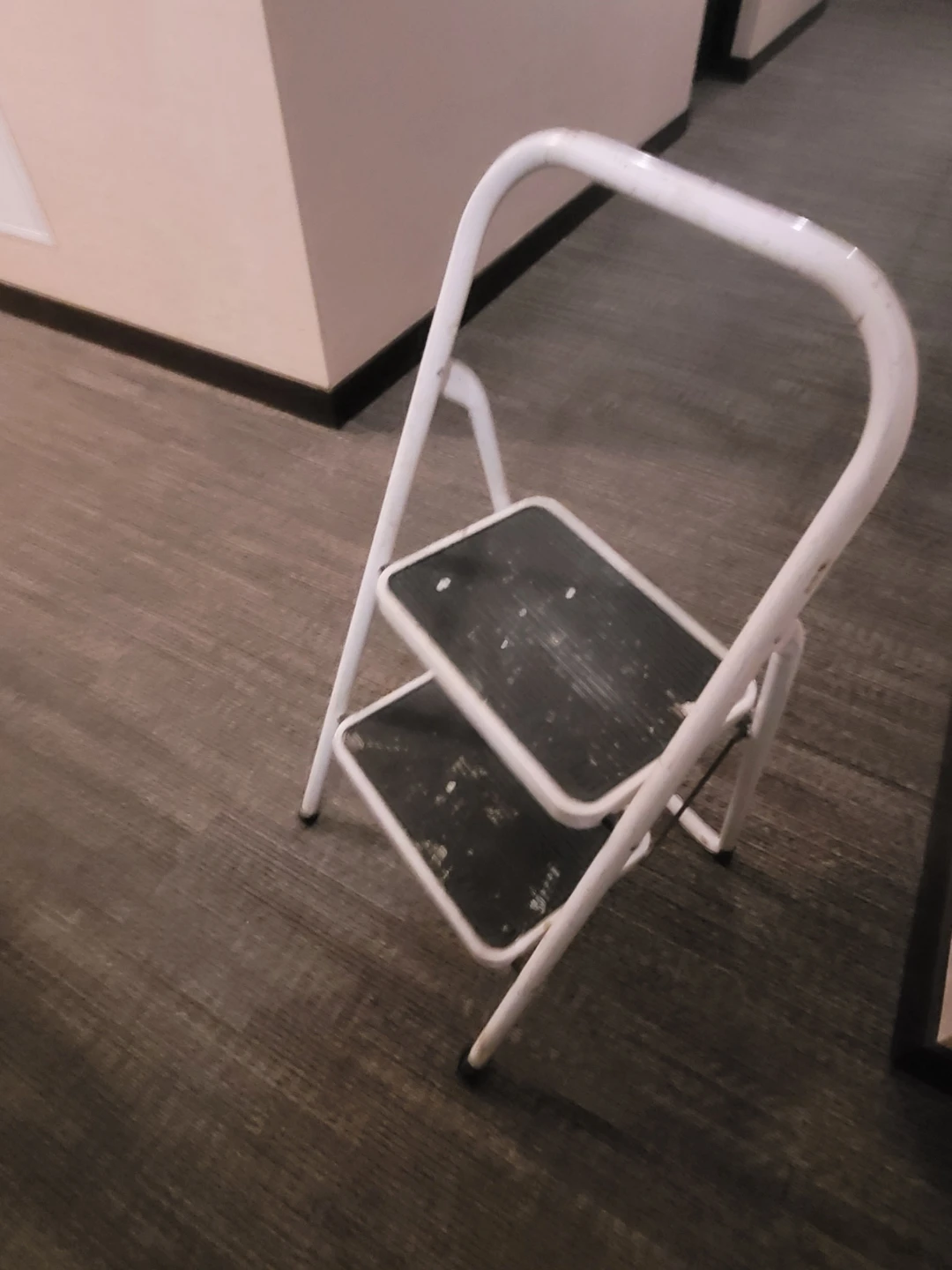 White metal frame with black non-slip treads. This 2-step stool folds flat for easy storage. It's useful for reaching higher shelves or cupboards.It is heavy duty.
