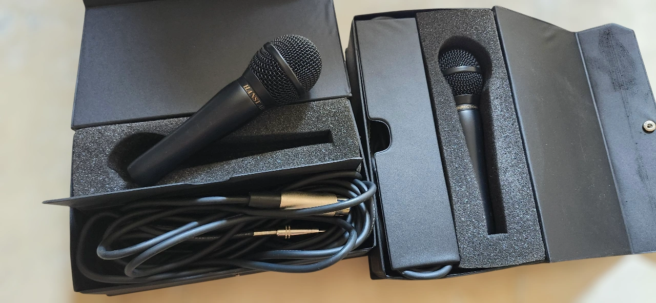 Selling two HANSTAR DM-2000 Uni-Directional Dynamic Microphones! They both come with their original boxes and included cables. Perfect for anyone looking for a reliable microphone for singing or speaking
