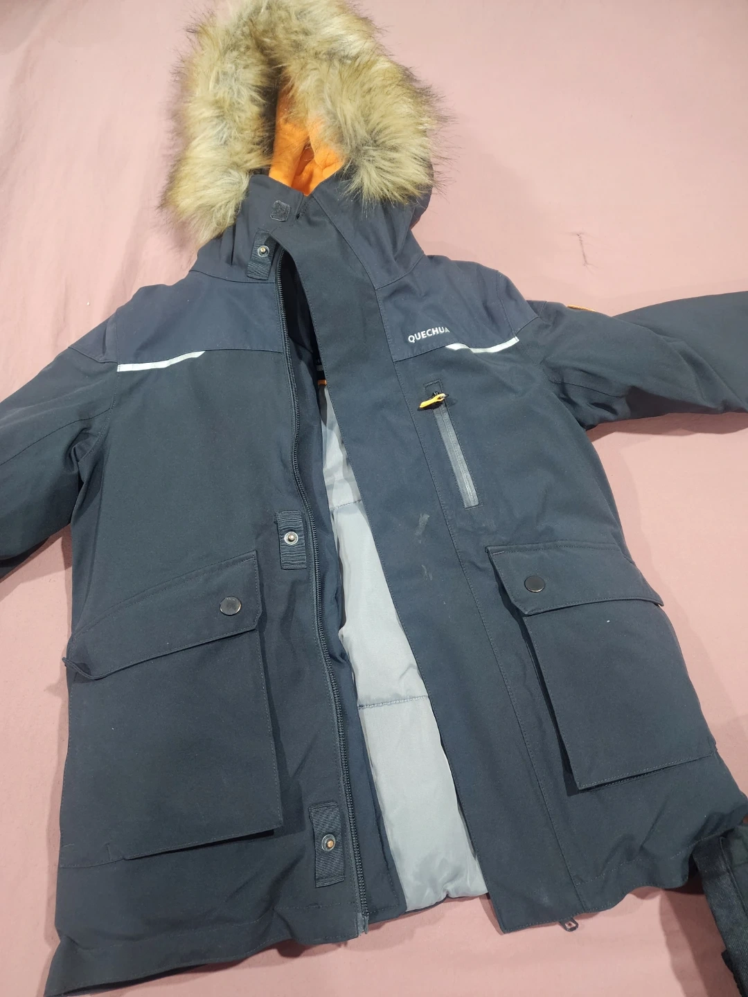 A Quechua jacket and Gusti snow pants set for winter adventures. The jacket features a faux-fur trimmed hood and insulated lining. Pants have adjustable suspenders for a snug fit. Perfect for keeping warm on the slopes!