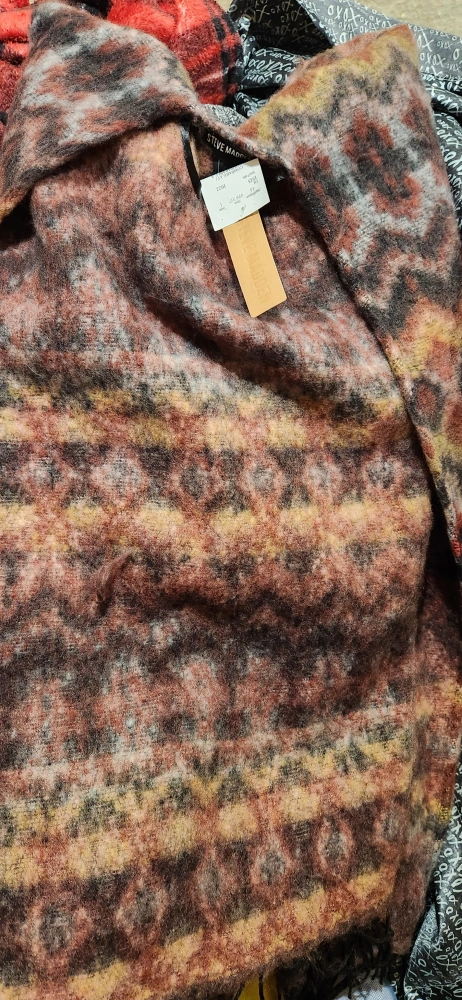 Selling a brand new Steve Madden ponchowith the tags still attached! It's a beautiful, unique sweater in size OSFM (One Size Fits Most). The material is a blend of polyester and rayon, and the colour is a mix of brown, red, and yellow tones. Perfect for adding a cozy touch to your wardrobe!