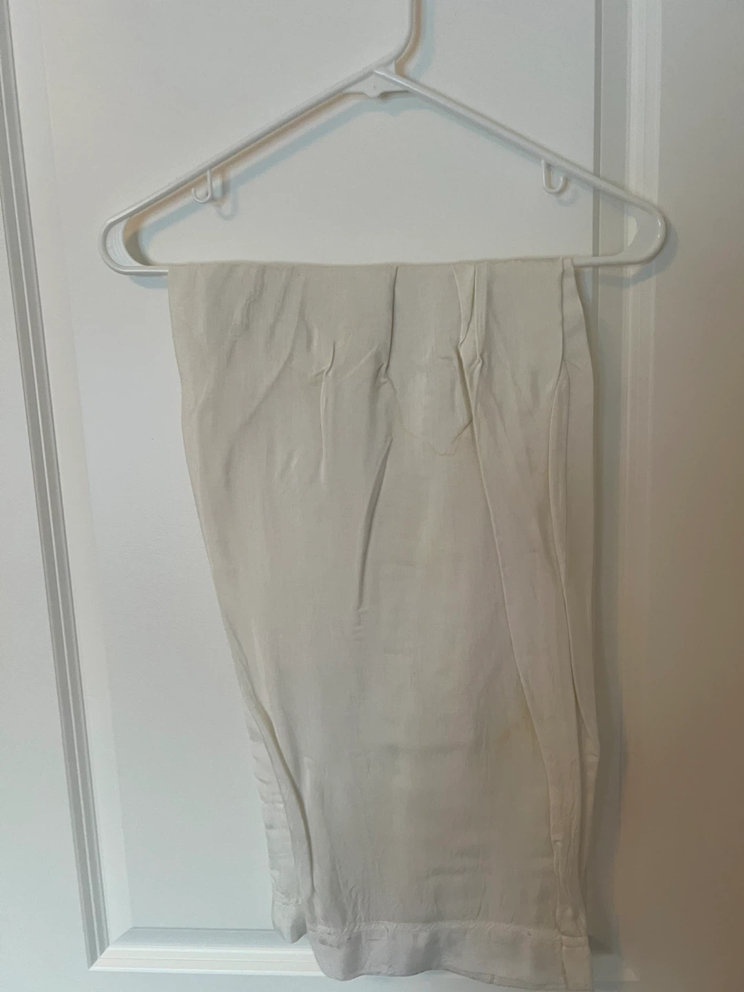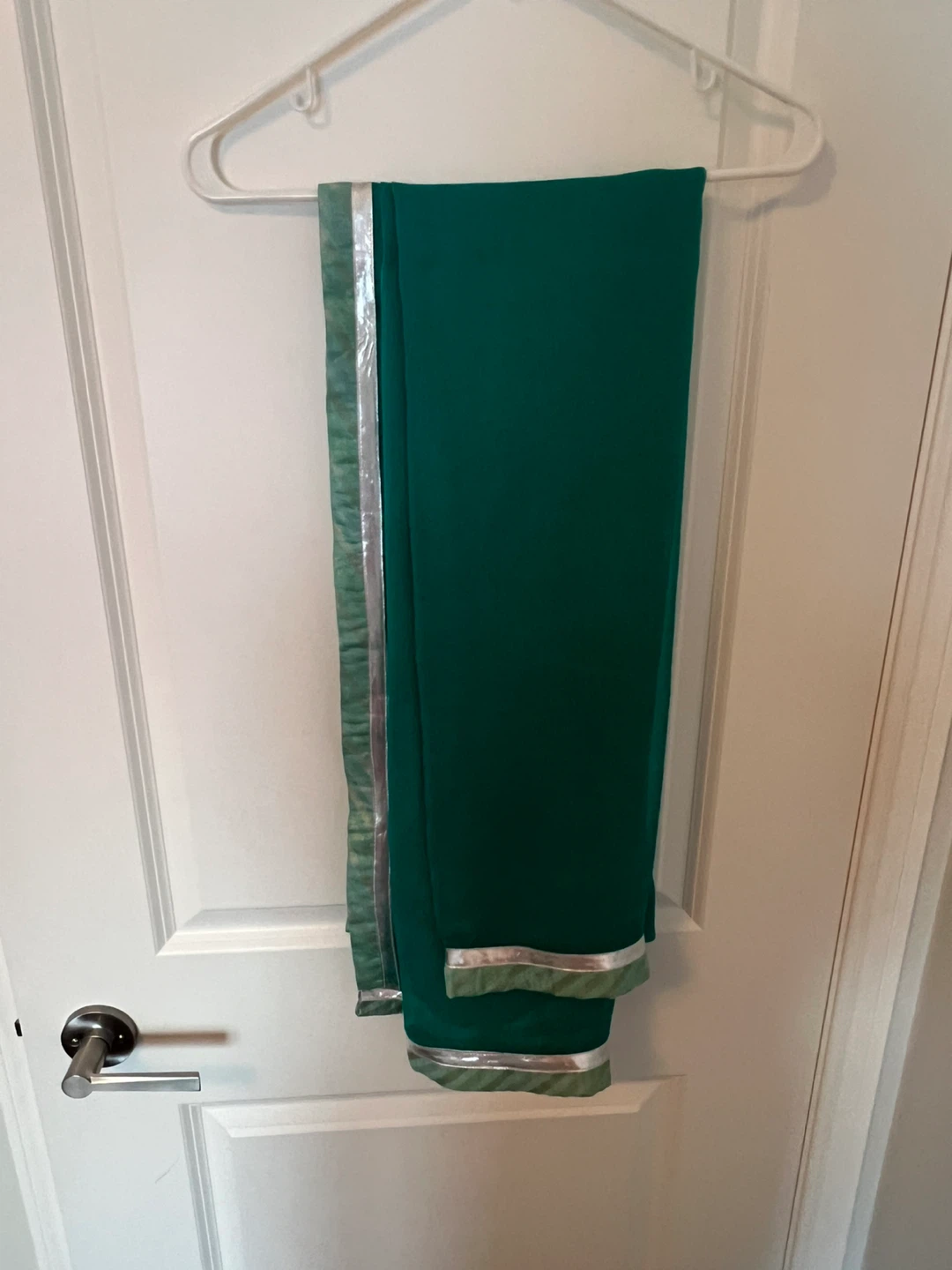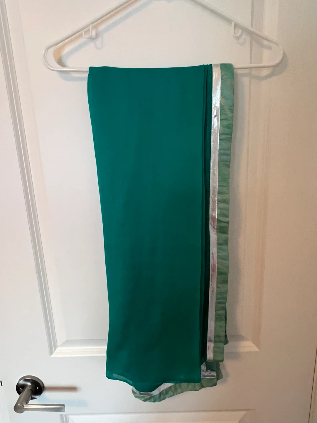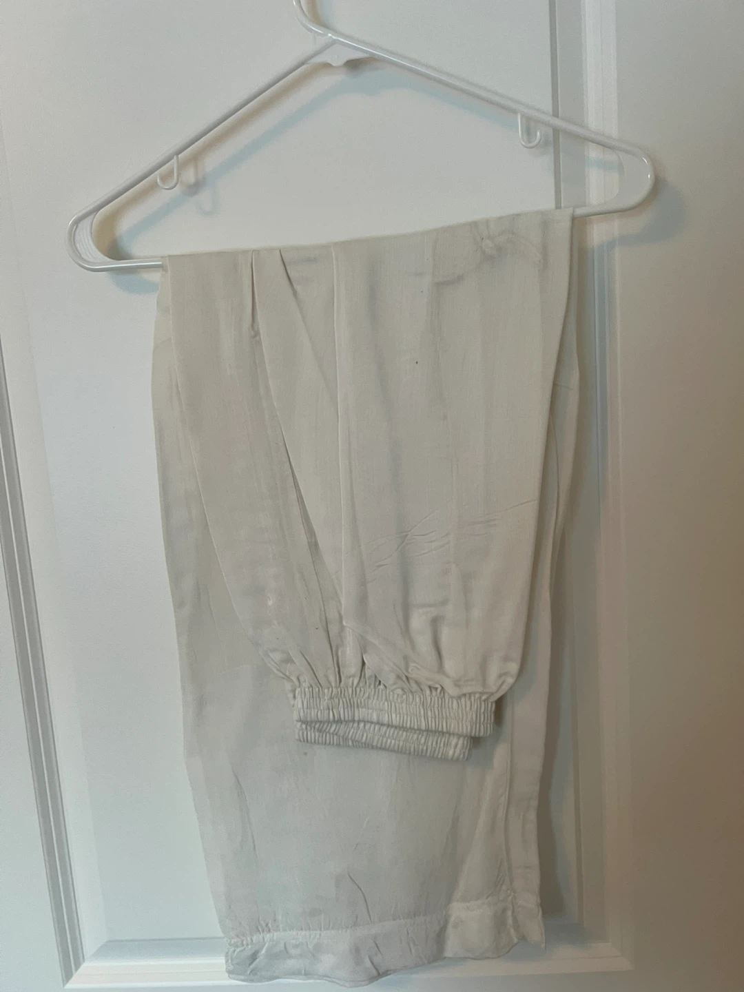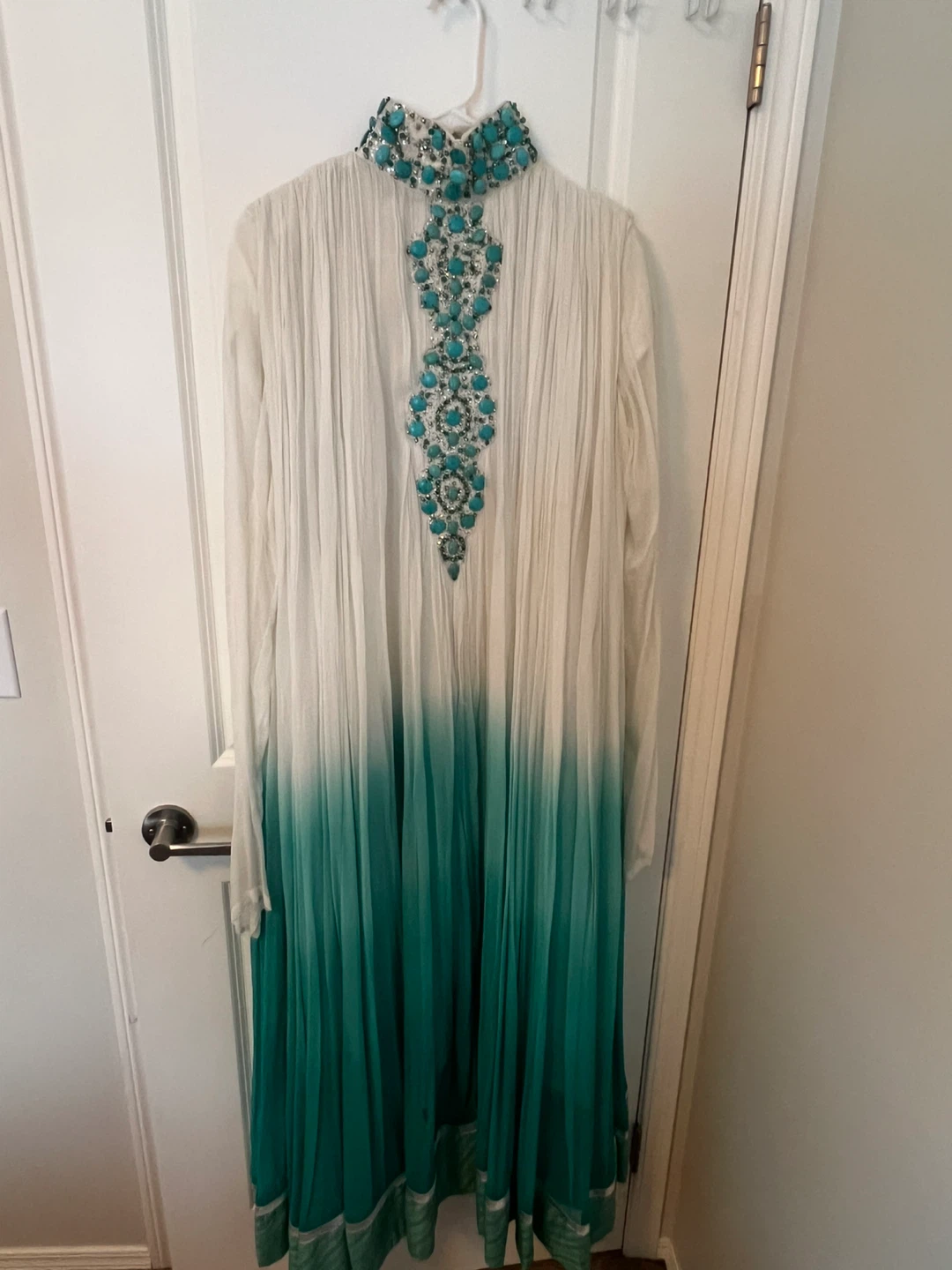 Selling a beautiful salwar kameez! The top is white with a teal ombre effect and intricate embellishments around the neckline. It comes with white pants. Perfect for a special occasion!