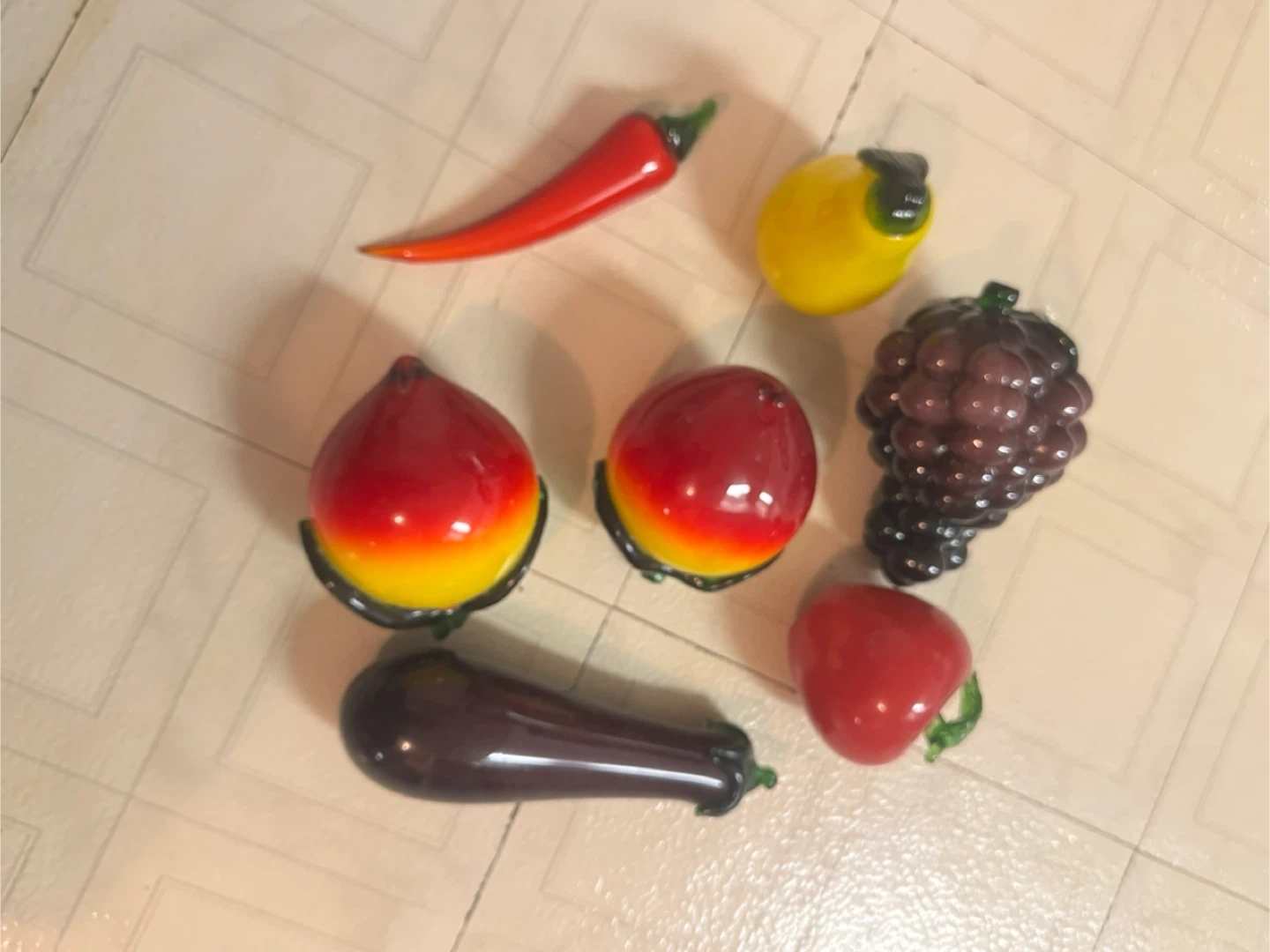 This is a collection of glass decorative fruits and vegetables. It includes items like grapes, peaches, eggplant, chili pepper, lemon, and strawberry.