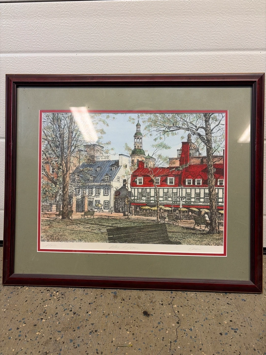 This is a framed print depicting a historic scene in Old Quebec. It features classic architecture with red roofs and a prominent church steeple. The artwork is matted and housed in a dark wood frame. This print would add a touch of historical charm to any room.
