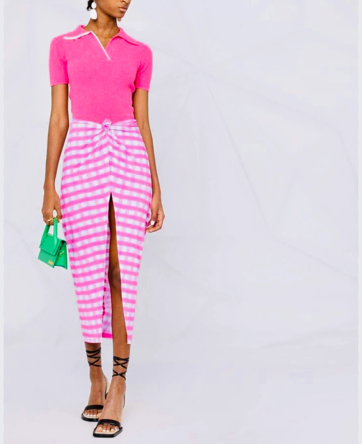 A pink and white gingham wrap skirt. It ties at the waist and has a side slit.