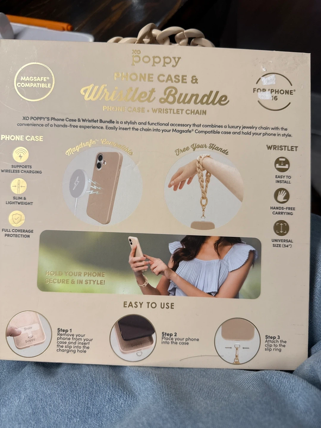 This bundle includes a beige phone case and a matching wristlet chain. The phone case is MagSafe compatible, supports wireless charging, and offers full coverage protection. It's slim and lightweight. The wristlet is easy to install for hands-free carrying. Keep your phone secure and stylish!
