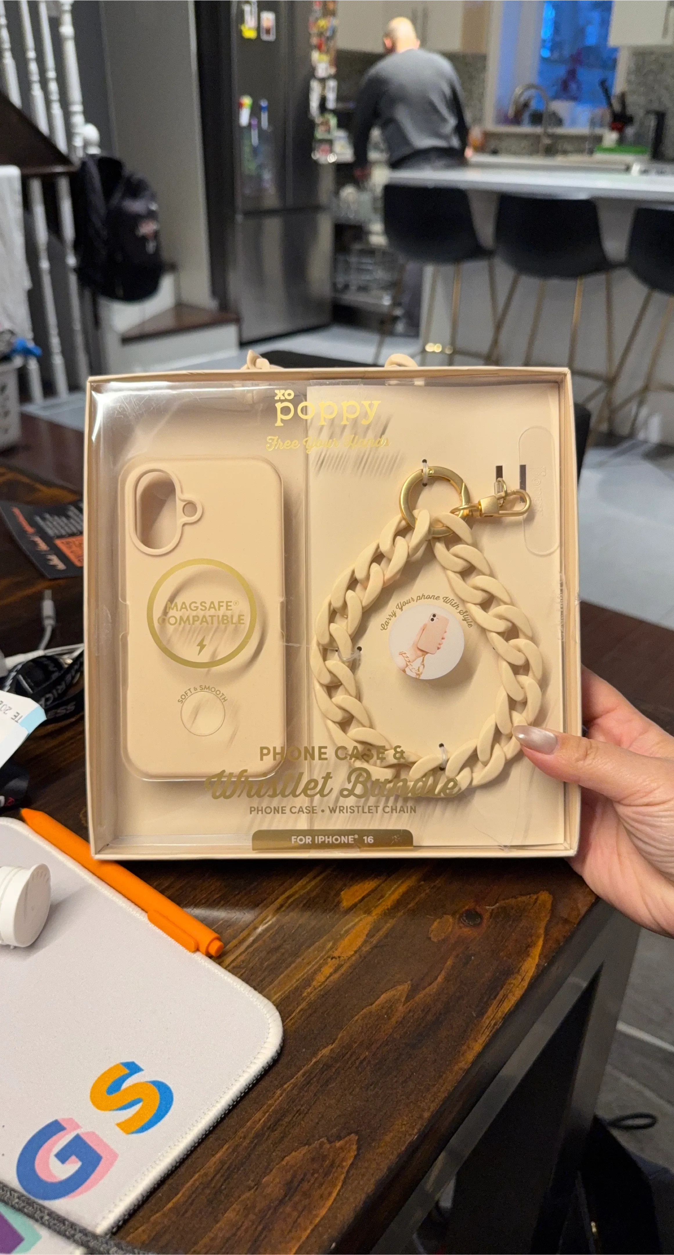This bundle includes a beige phone case and a matching wristlet chain. The phone case is MagSafe compatible, supports wireless charging, and offers full coverage protection. It's slim and lightweight. The wristlet is easy to install for hands-free carrying. Keep your phone secure and stylish!