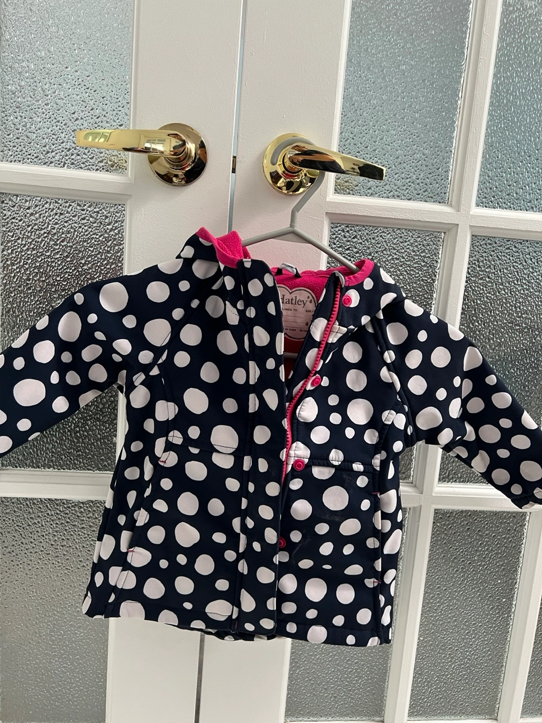 Adorable Hatley jacket. Size 3. Polka dot print. Great for spring or fall. Features a hood and snap closures.