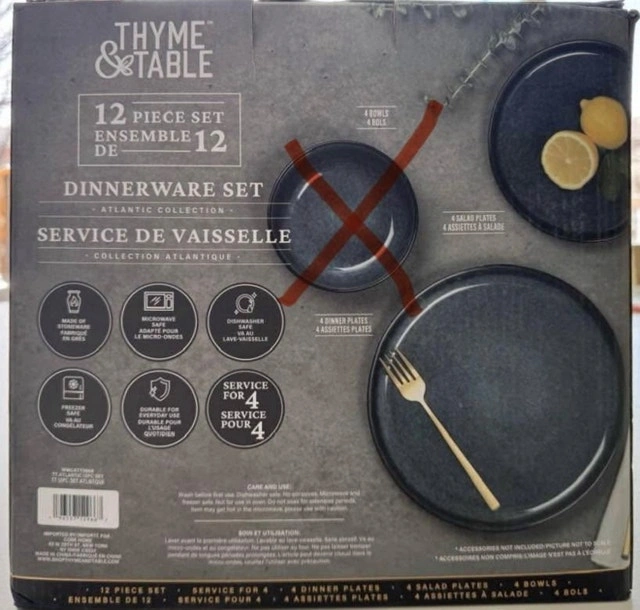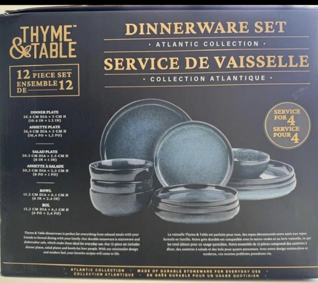 Originally a 12-piece set, this Thyme & Table Atlantic Blue stoneware collection brings modern style and everyday durability to your table. Please note: 4 bowls are missing, leaving 8 brand-new plates (4 dinner plates + 4 salad plates). The missing pieces are shown in the photos. Details: • Premium stoneware with a rich Atlantic Blue finish • Includes: 4 dinner plates + 4 salad plates (no bowls) • Brand new, unused, and in the original box • Microwave safe • Dishwasher safe (hand wash recommended for longevity) Perfect for anyone who already owns this set and needs matching pieces — or anyone looking for a stylish, high-quality partial set at a great value. Cash accepted.