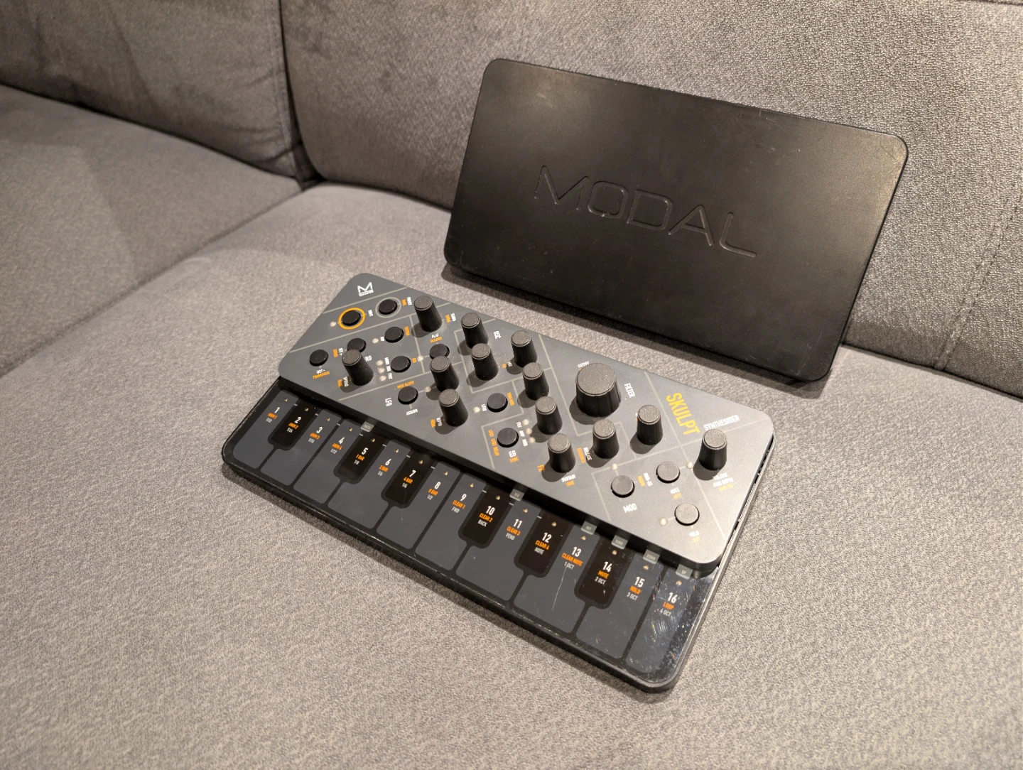 Modal Skulpt Synthesizer with a compact design. It features a 32-step sequencer and multiple built-in effects. Includes the protective cover.