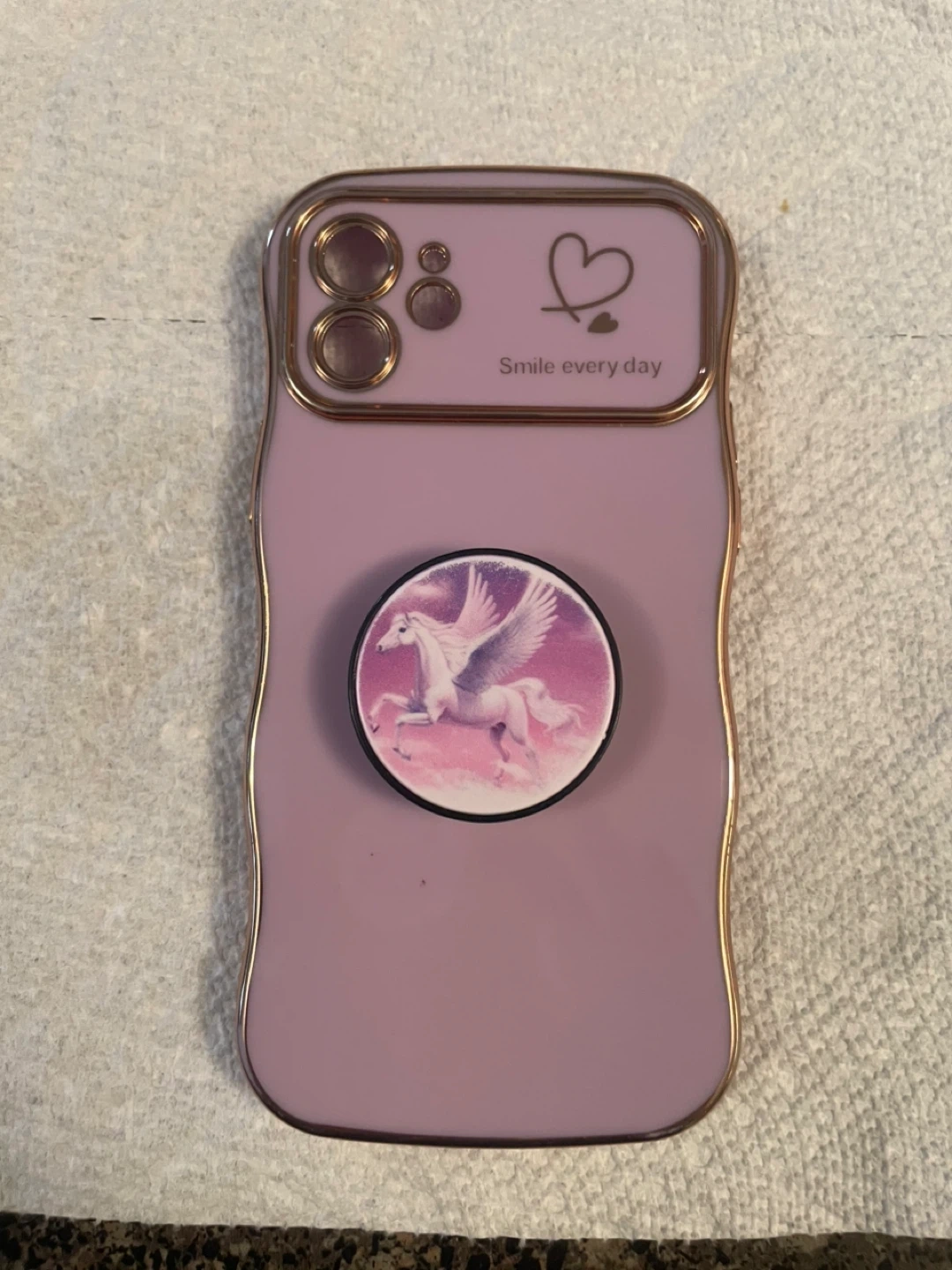 Selling a cute purple iPhone 12 case! It has a gold trim and a pop socket with a unicorn design. "Smile every day" is written on the case as well.