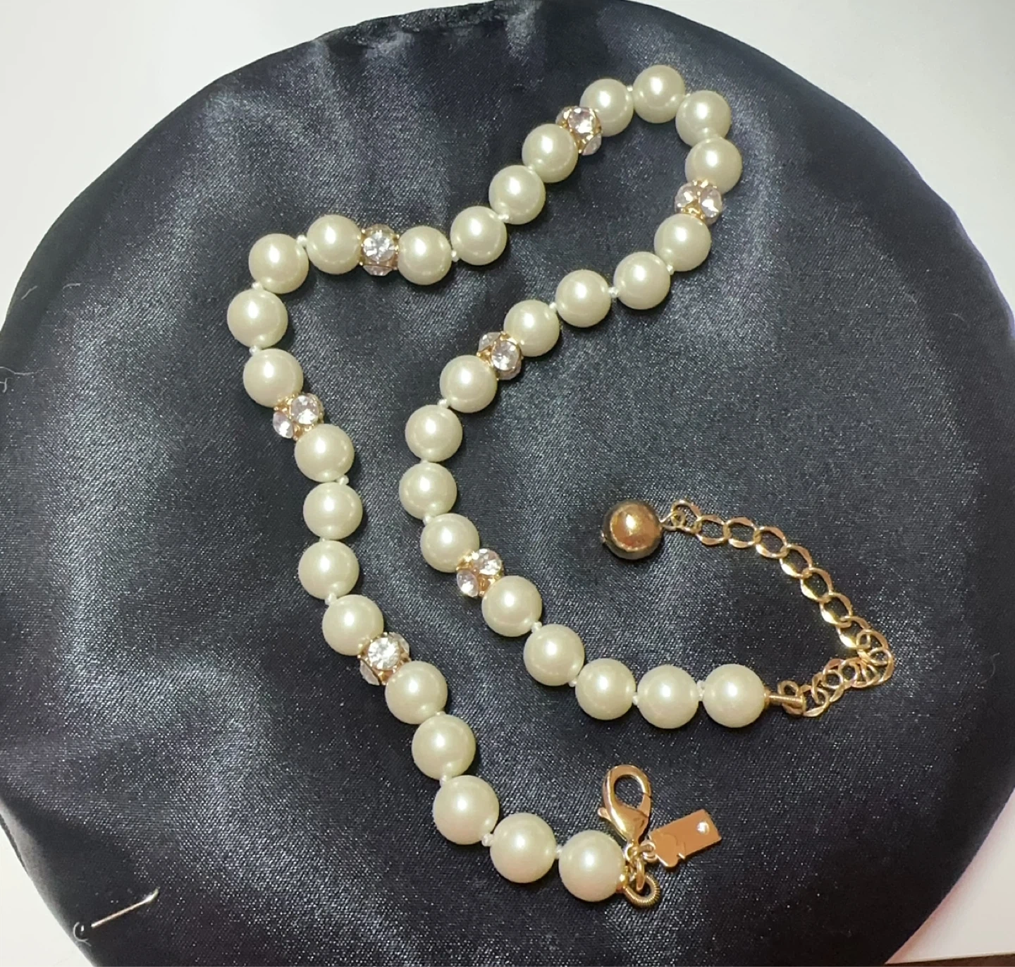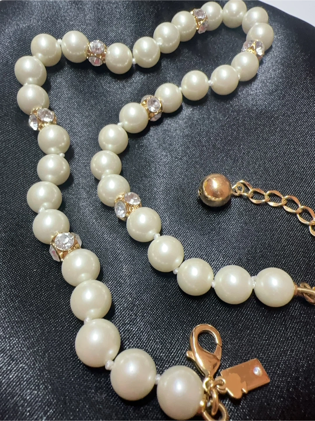 This is a beautiful Kate Spade pearl necklace with crystal accents. It's in great condition and perfect for adding a touch of elegance to any outfit. Not brand new small tiny wear shows on picture 4.