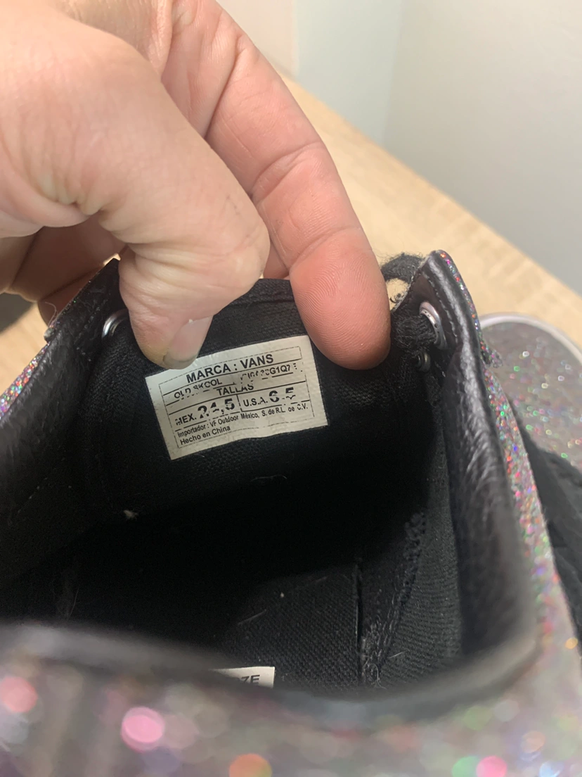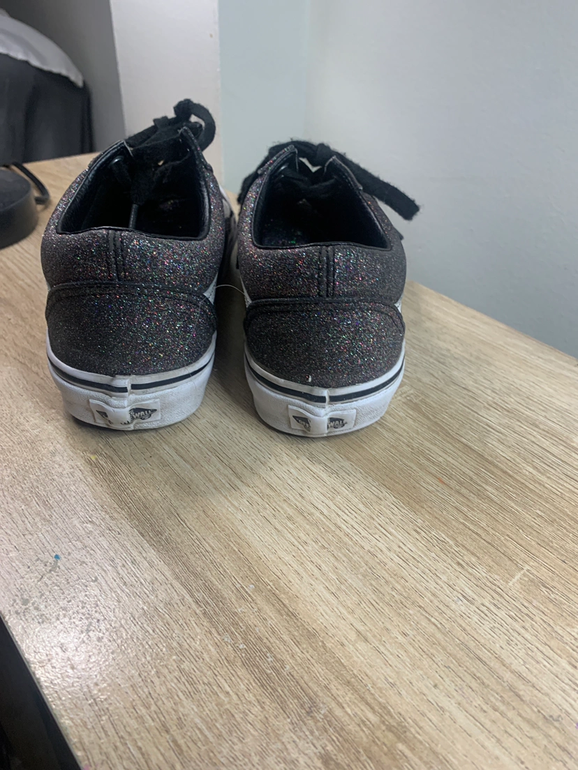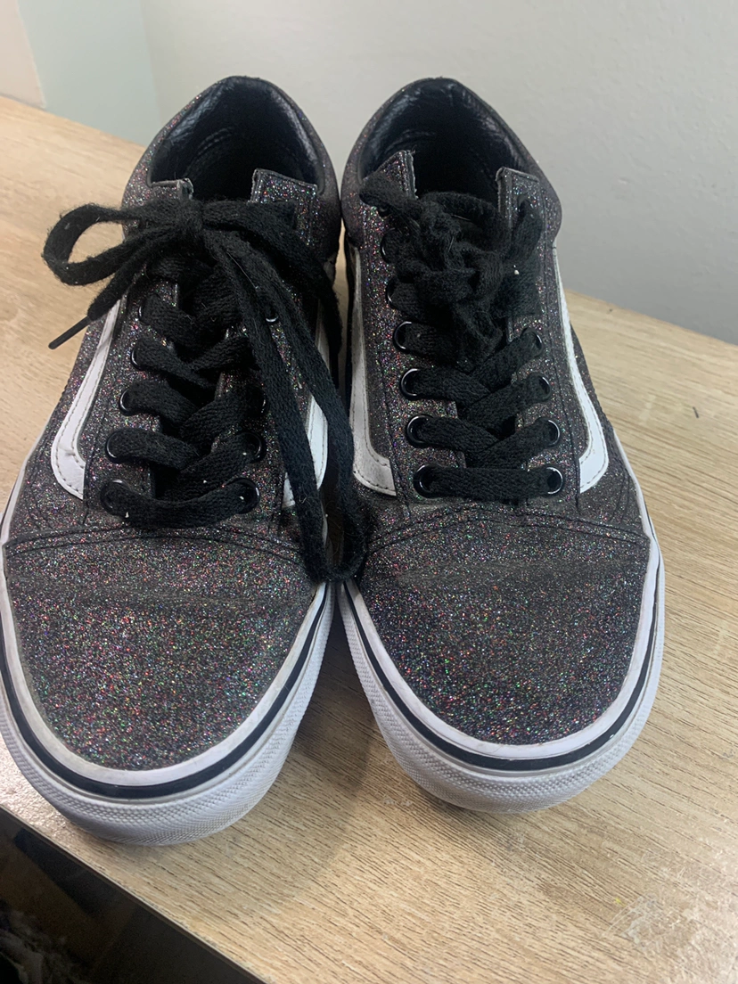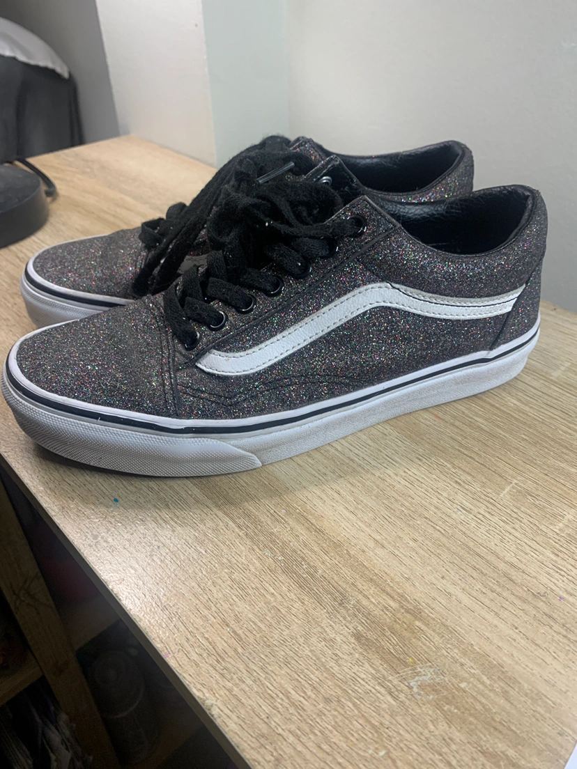 These old skool glitter rainbow black vans in woman’s size 8.5 are cute and comfortable. I’ve worn them around my house a handful of times . So they are used but remain in great condition. .