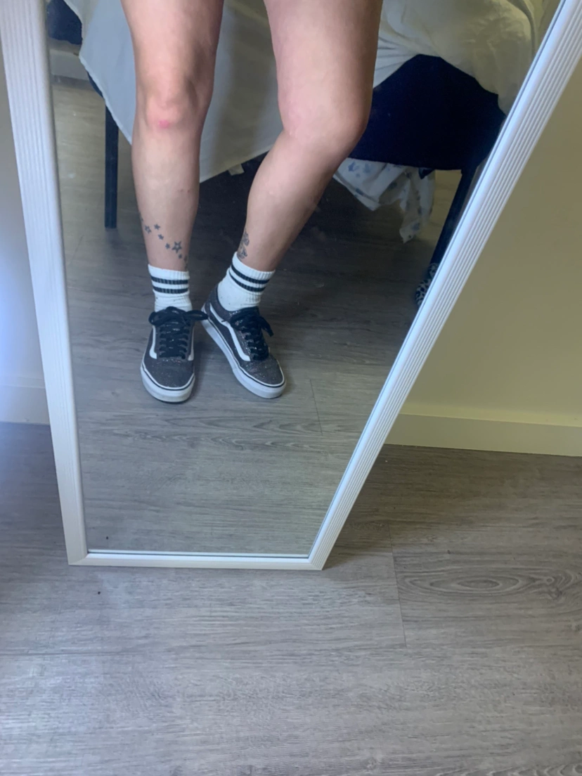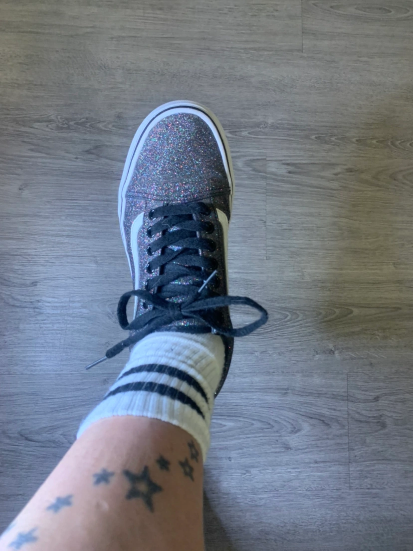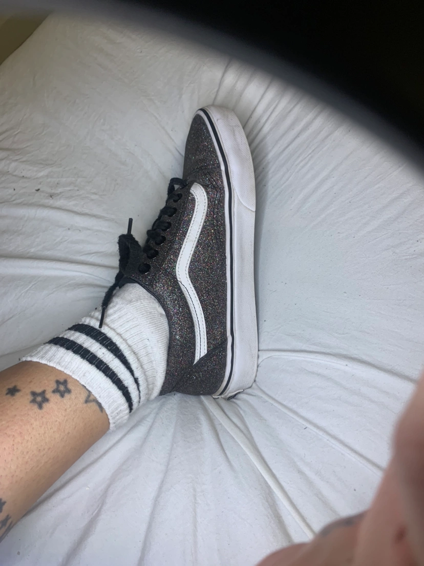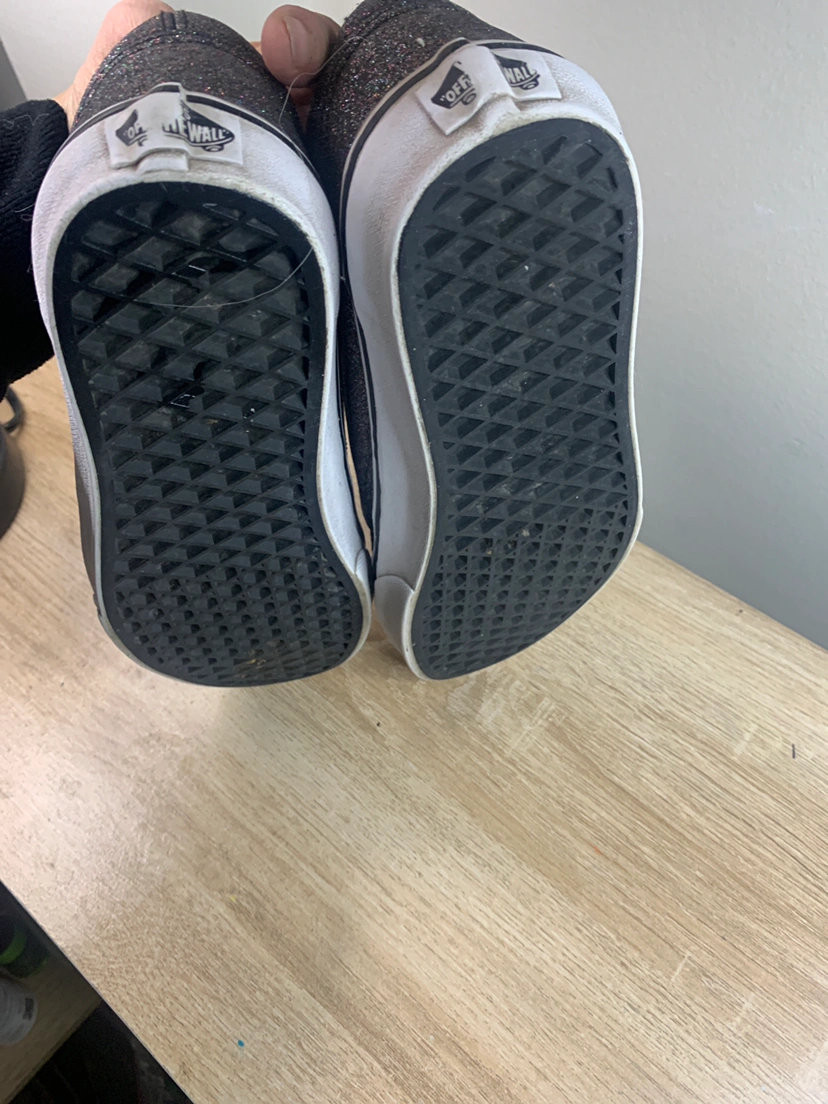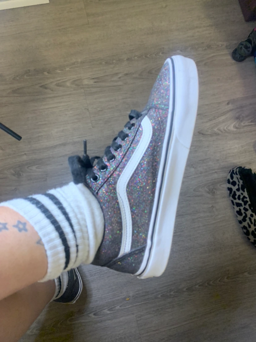 These old skool glitter rainbow black vans in woman’s size 8.5 are cute and comfortable. I’ve worn them around my house a handful of times . So they are used but remain in great condition. .