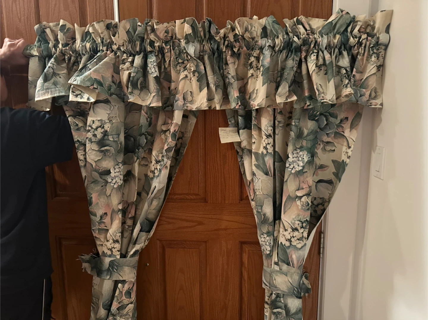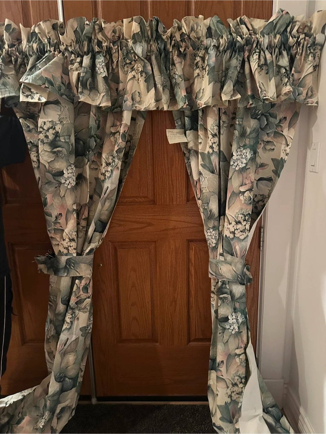 Selling a lovely floral print curtain set. It's perfect for adding a touch of elegance to any room. The set includes a valance and two curtain panels, all in excellent condition. The floral pattern features a mix of greens, creams, and soft pinks, creating a calming and inviting atmosphere. 1 set