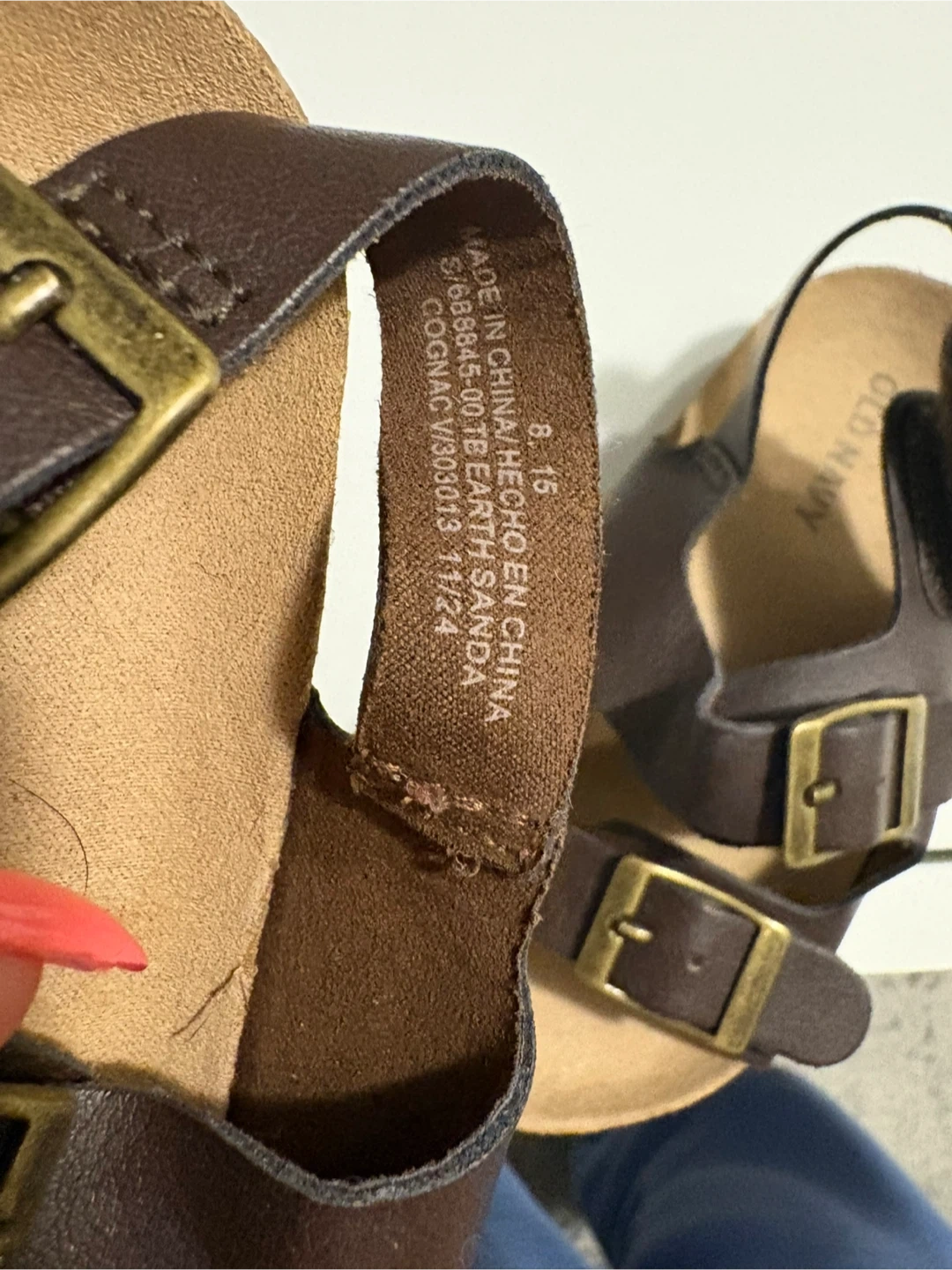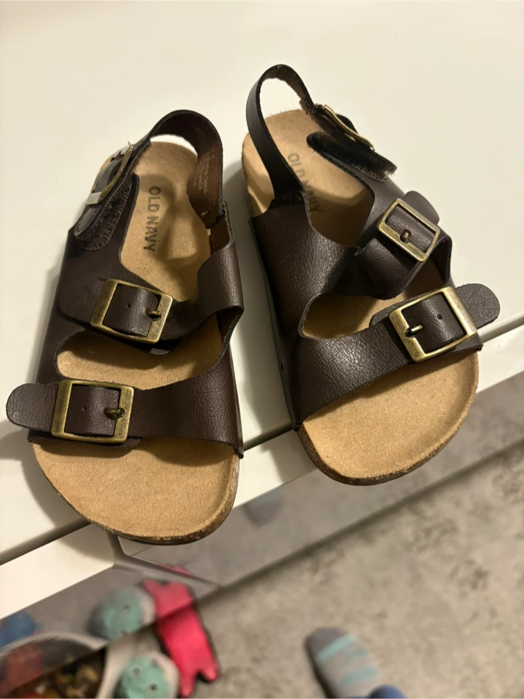 Classic brown Old Navy toddler sandals with adjustable buckles. Features a cork footbed and a durable rubber sole. These sandals are great for warm weather adventures!