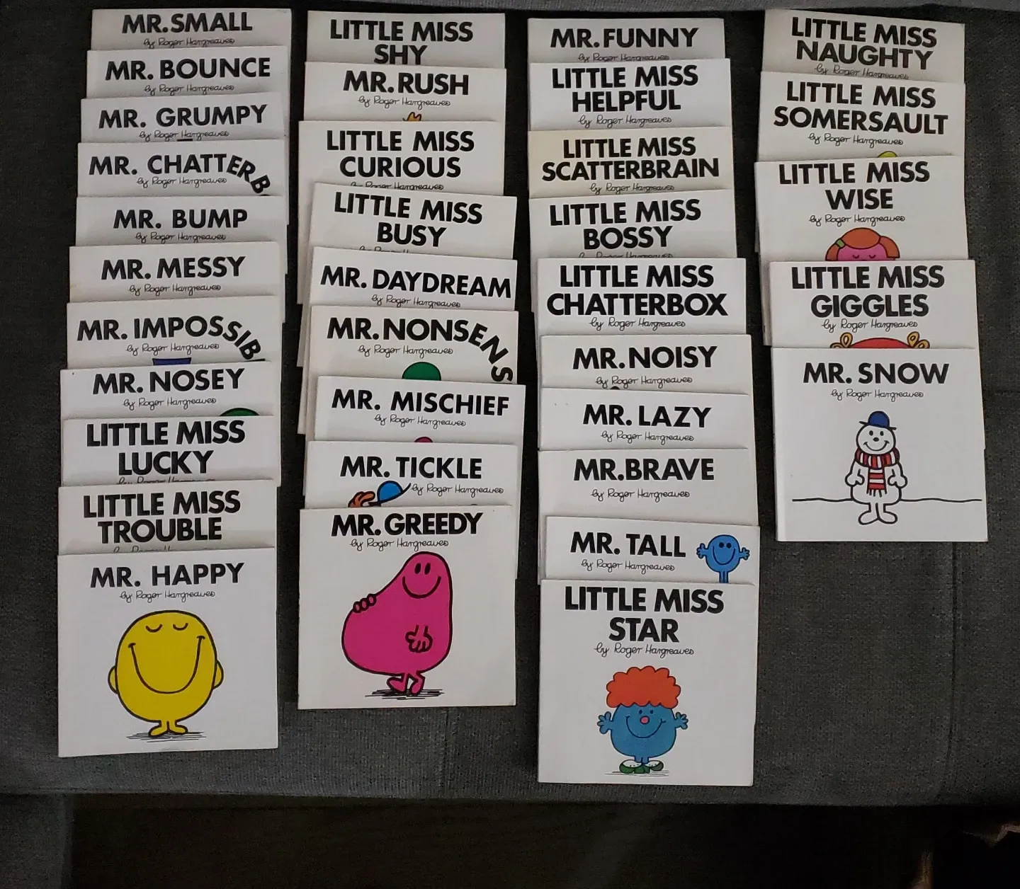 Selling a collection of Mr. Men and Little Miss books by Roger Hargreaves! These books are in great shape and ready for a new reader. Perfect for kids and adults alike, these charming stories are sure to bring a smile to your face. Check out the photos for the titles included! (35 books selling as a set)