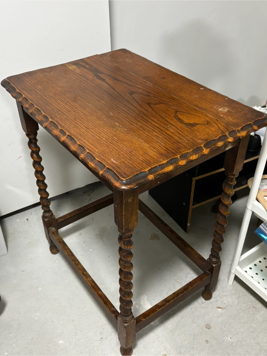 This vintage side table features a beautiful oak wood top with a carved edge. It has distinctive barley twist legs and a lower stretcher for stability. Wood material. Great for a living room or bedroom accent piece!