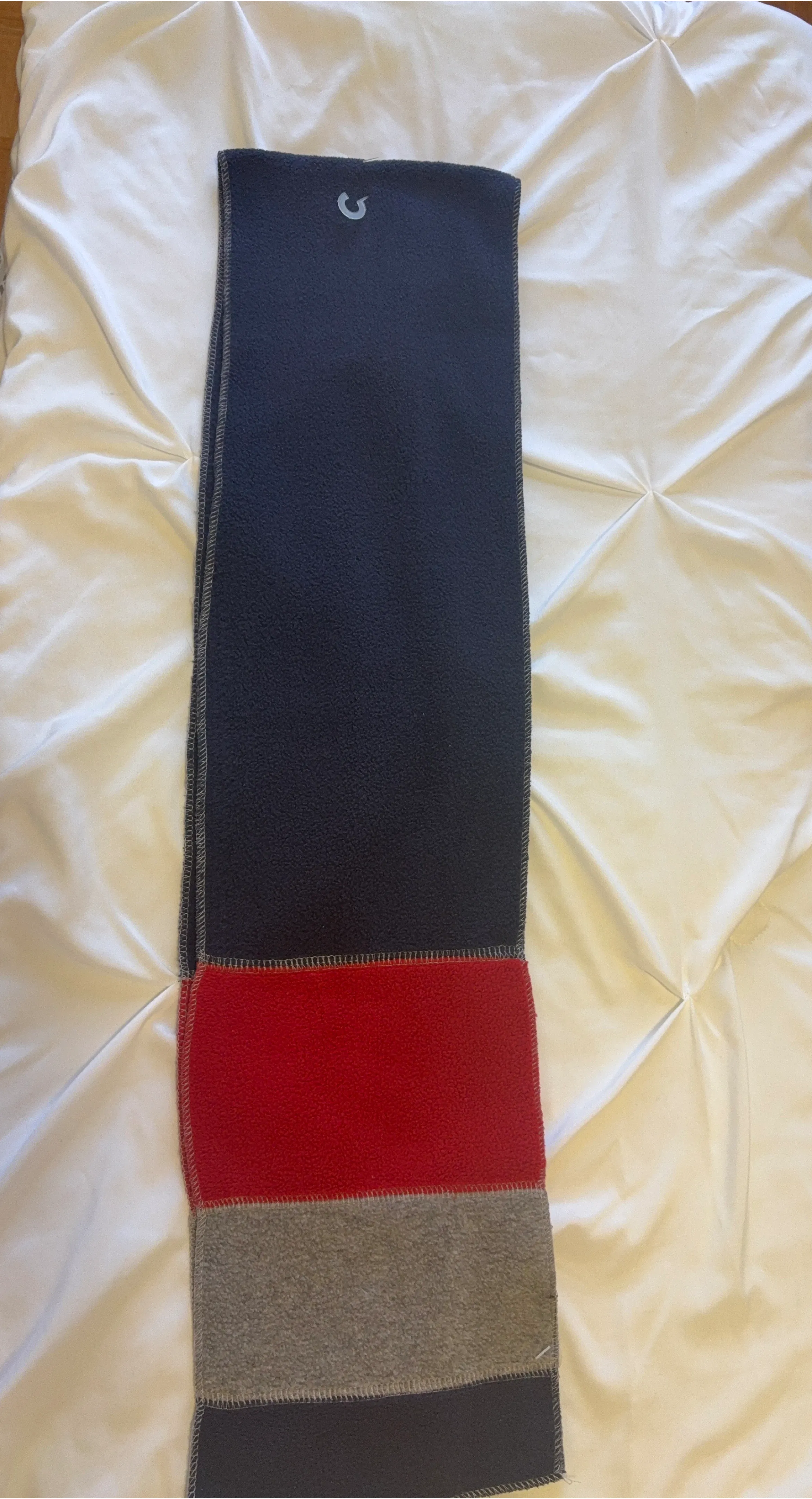 A cozy fleece scarf with a colour block design. It's made of soft material and features navy, red, and grey panels. This scarf is great for staying warm on cooler days!