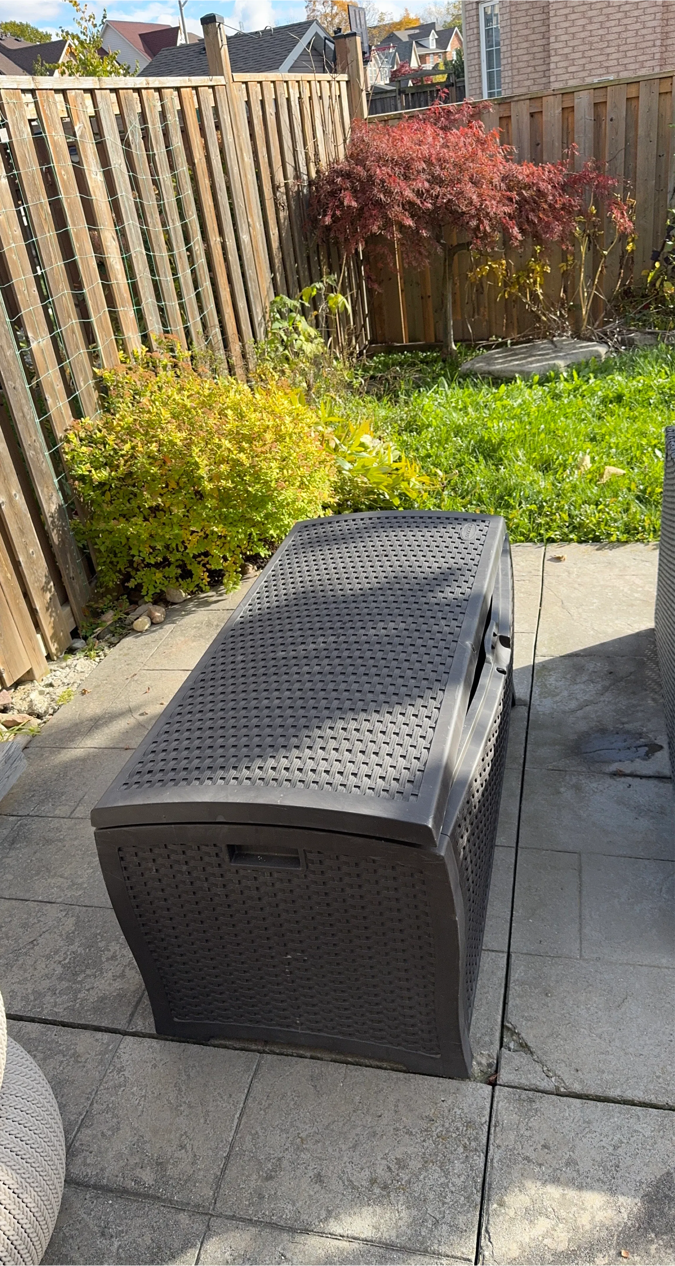 Selling a brown wicker-style outdoor storage box. It's perfect for storing cushions, gardening tools, or anything else you want to keep dry and organized on your patio or deck! It's in decent condition and ready for a new home.