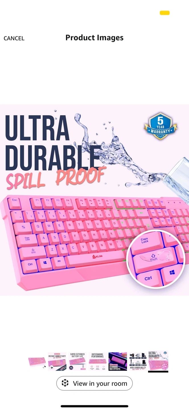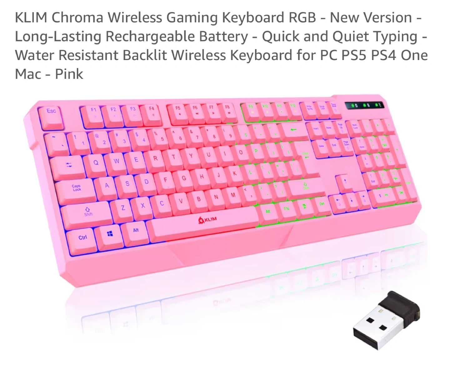 72Selling a Klim Chroma wireless gaming keyboard in pink! This keyboard features long-lasting rechargeable battery and quick and quiet typing. It's water-resistant and backlit, perfect for PC, PS5, PS4, One Mac. It has instant connectivity, no drivers needed, just plug and play! It also has stunning RGB effects