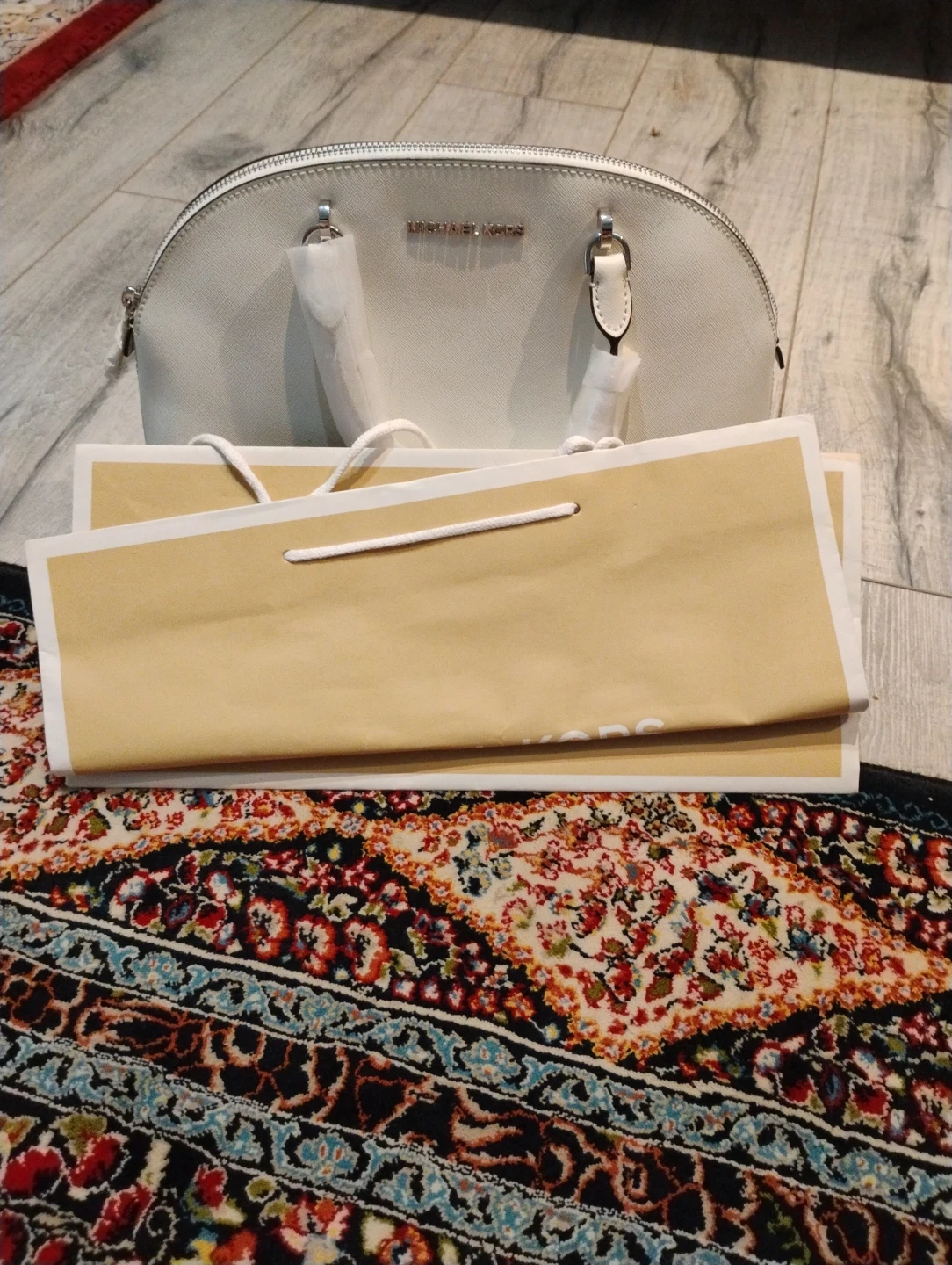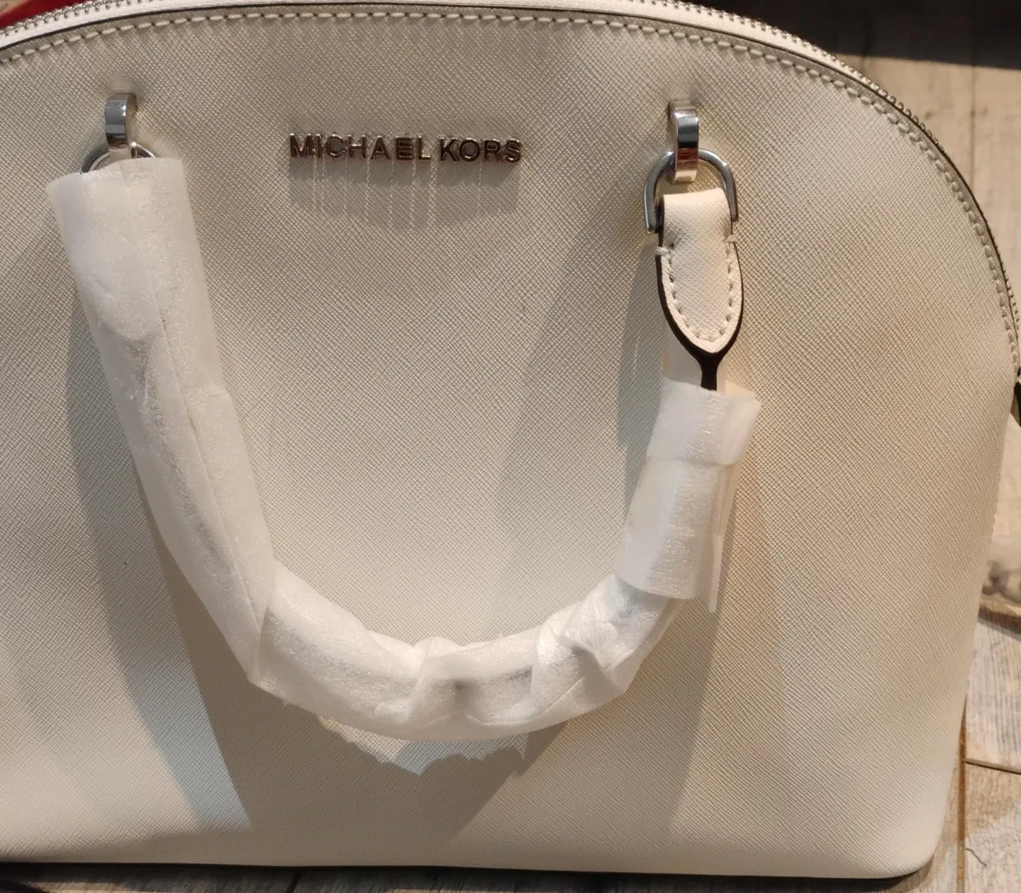White leather satchel handbag by Michael Kors. It's a classic dome shape with top handles and a detachable shoulder strap. Includes the original dust bag for protection. Perfect for everyday use!