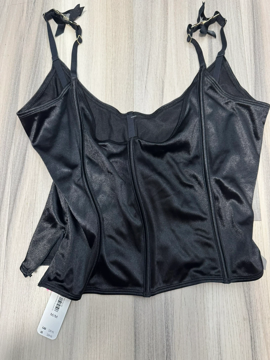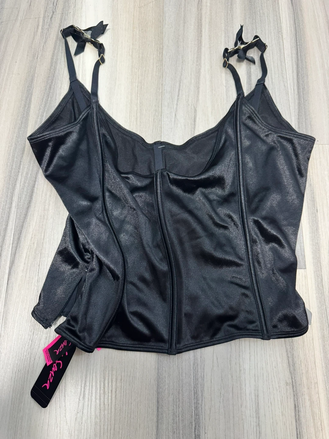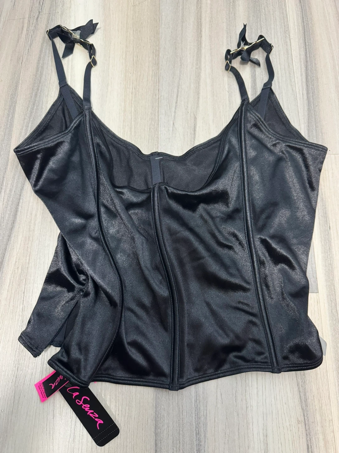 Black satin corset top from La Senza. Size M/M. Adjustable straps with bow details. Hook-and-eye closure at the front.