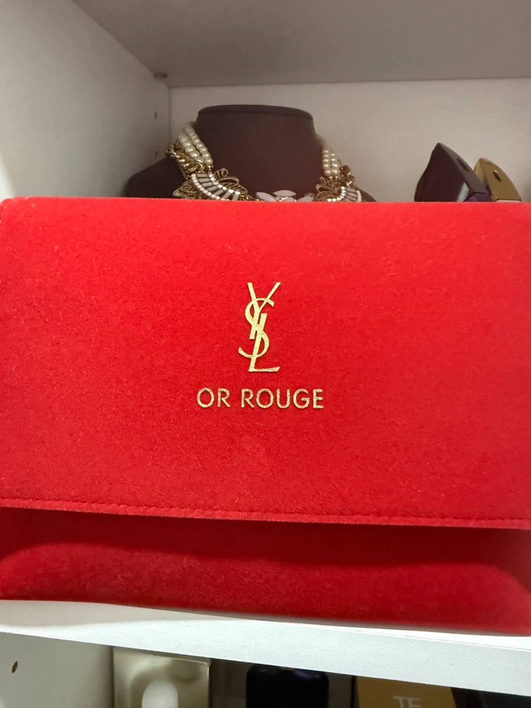 This is a red velvet clutch bag with a gold chain strap. It features the "YSL" logo and "OR ROUGE" text. It's perfect for a night out!