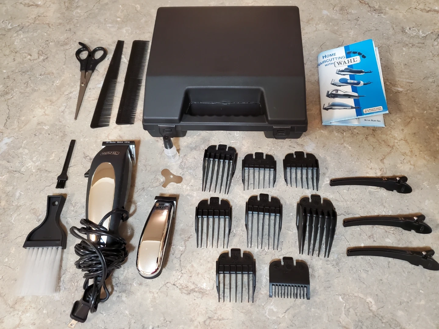 Complete Wahl home haircutting kit. It has a main clipper and a smaller trimmer for detailing. The smaller trimmer has never been used. Comes with lots of guide combs, scissors, hair clips, cleaning brushes, oil (new, sealed), and the original case. Manual is included too. Works great. Super clean, ready to go.