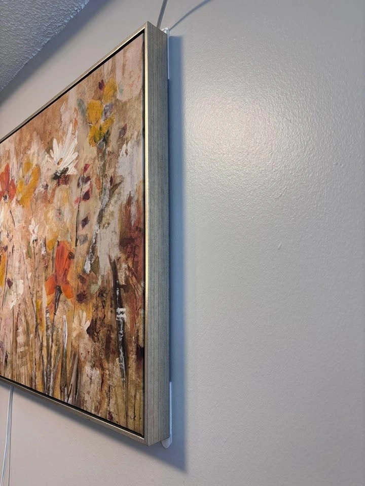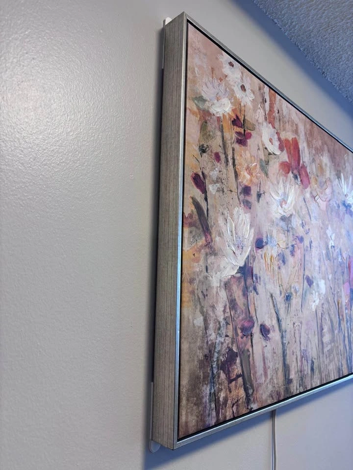 Dimensions: 37" x 25" x 2". Silver frame. Spotless. Pet and smoke-free home. Like new. This is the "Jostle" canvas art print by artist Jill Martin, featuring an abstract floral meadow design.
