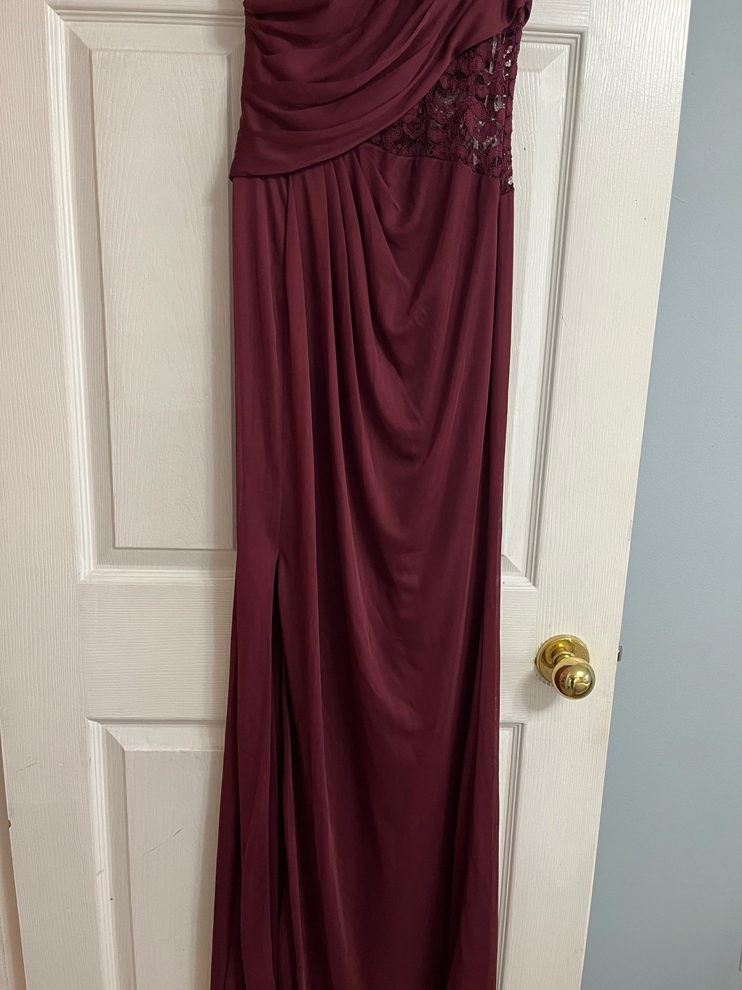 One shoulder Bridemaids dress with lace detailing on the side and a slit on the leg - burgundy/wine colour. Only worn once.