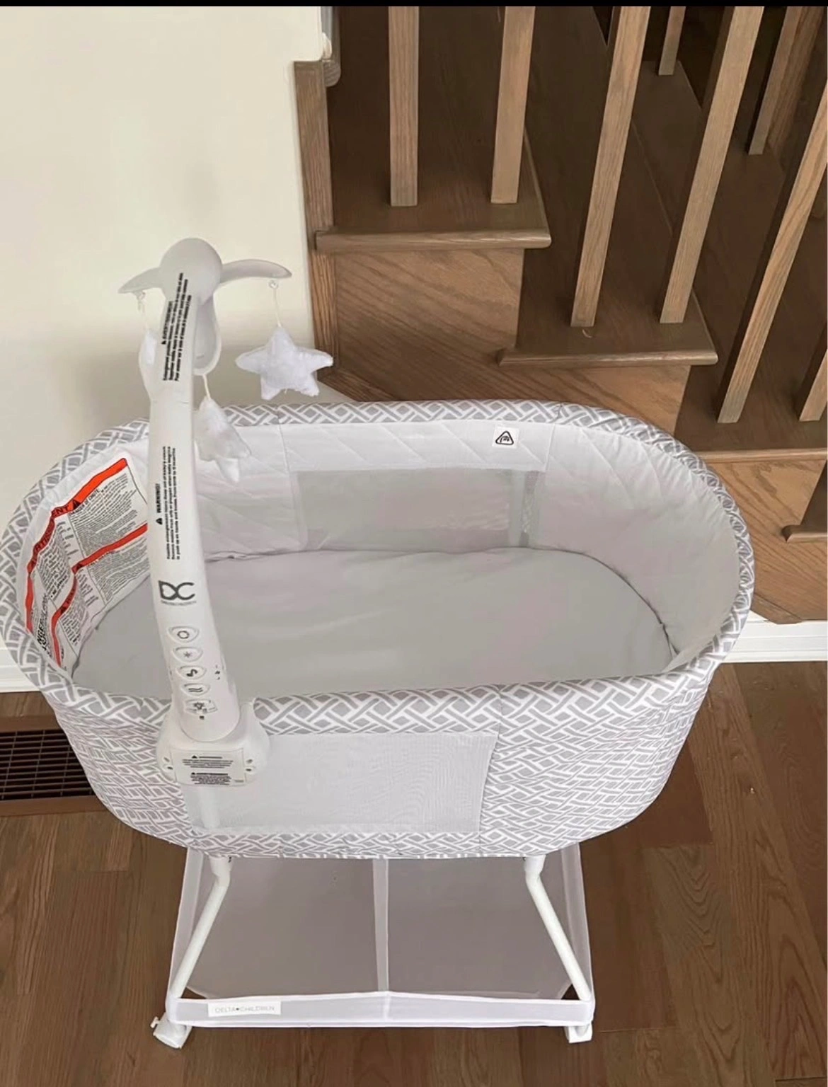 Bassinet has de mobile features spinning toys, a soft-glow nightlight, soothing sounds, vibrations and twinkle lights.