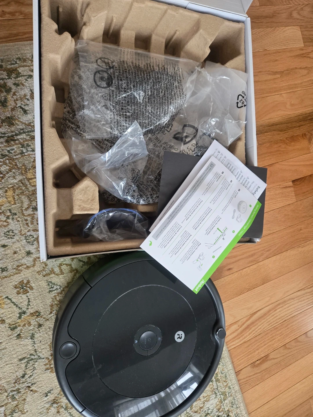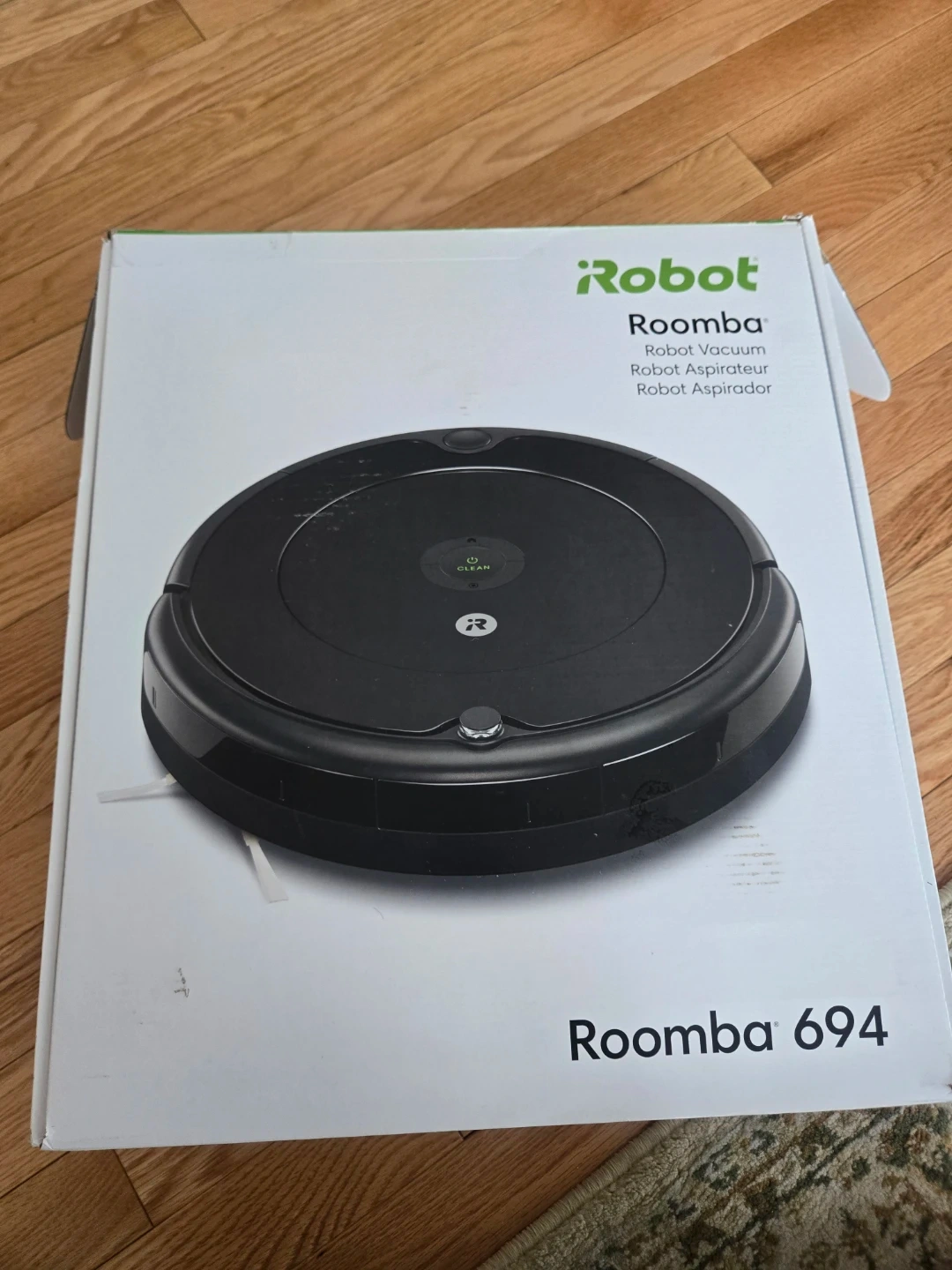 This iRobot Roomba 694 robot vacuum comes with its charging dock and power cord. It's black and works on carpets and hard floors. It's a great help for keeping your home tidy! I have one more so not using this much. It works well