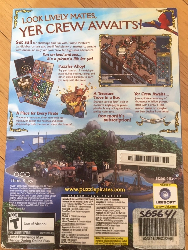 Puzzle Pirates computer game CD for Windows 98/ME/2000/XP and Mac OS X 10.3 compatible.