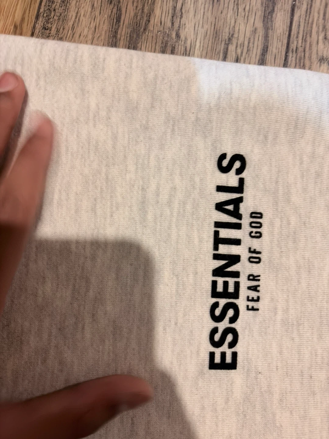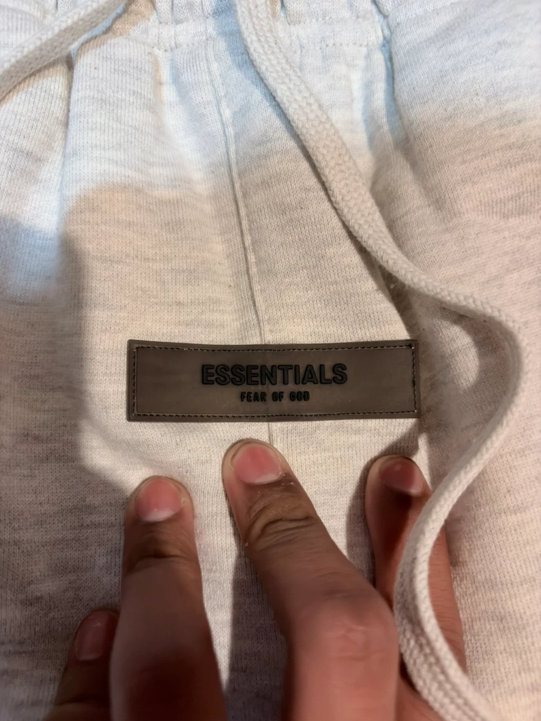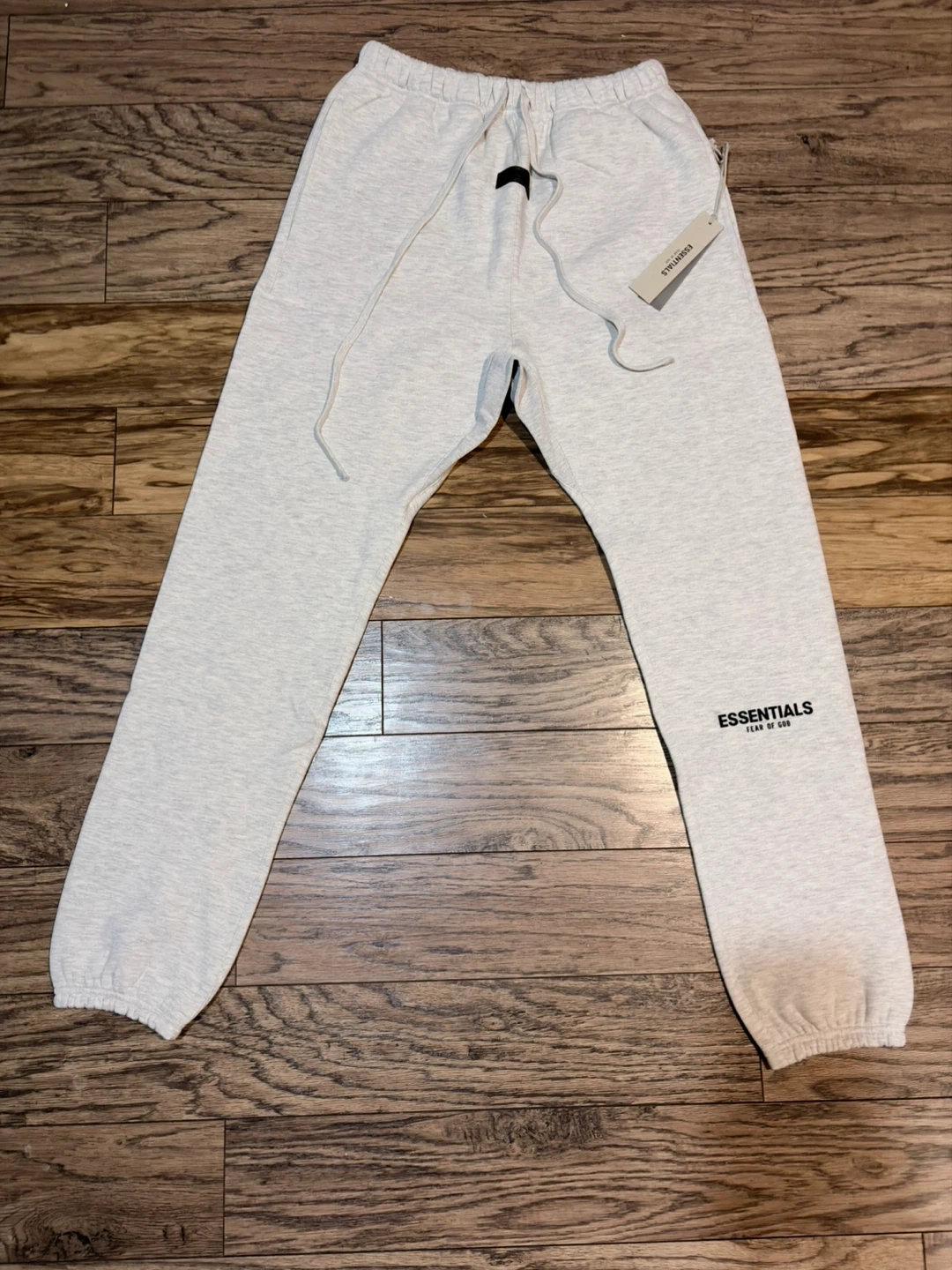 These are Fear of God Essentials sweatpants in a light heather grey colour. They're made from a soft, comfortable material perfect for lounging or casual wear. Features a drawstring waist and elastic cuffs for a snug fit.