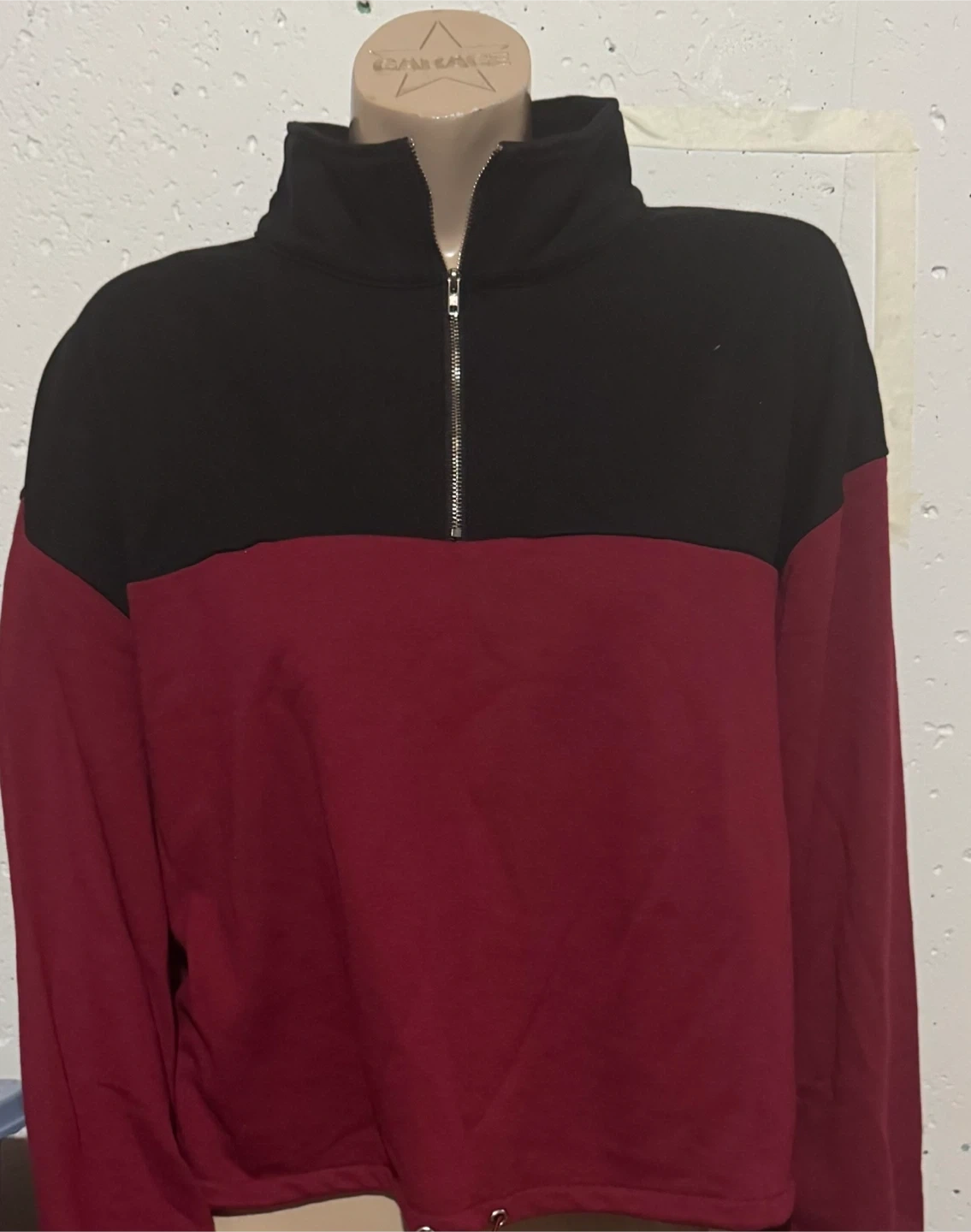 This is a colour block half zip pullover from V Trim! It's a really stylish piece, with a black top and a red bottom. Perfect for layering or wearing on its own!