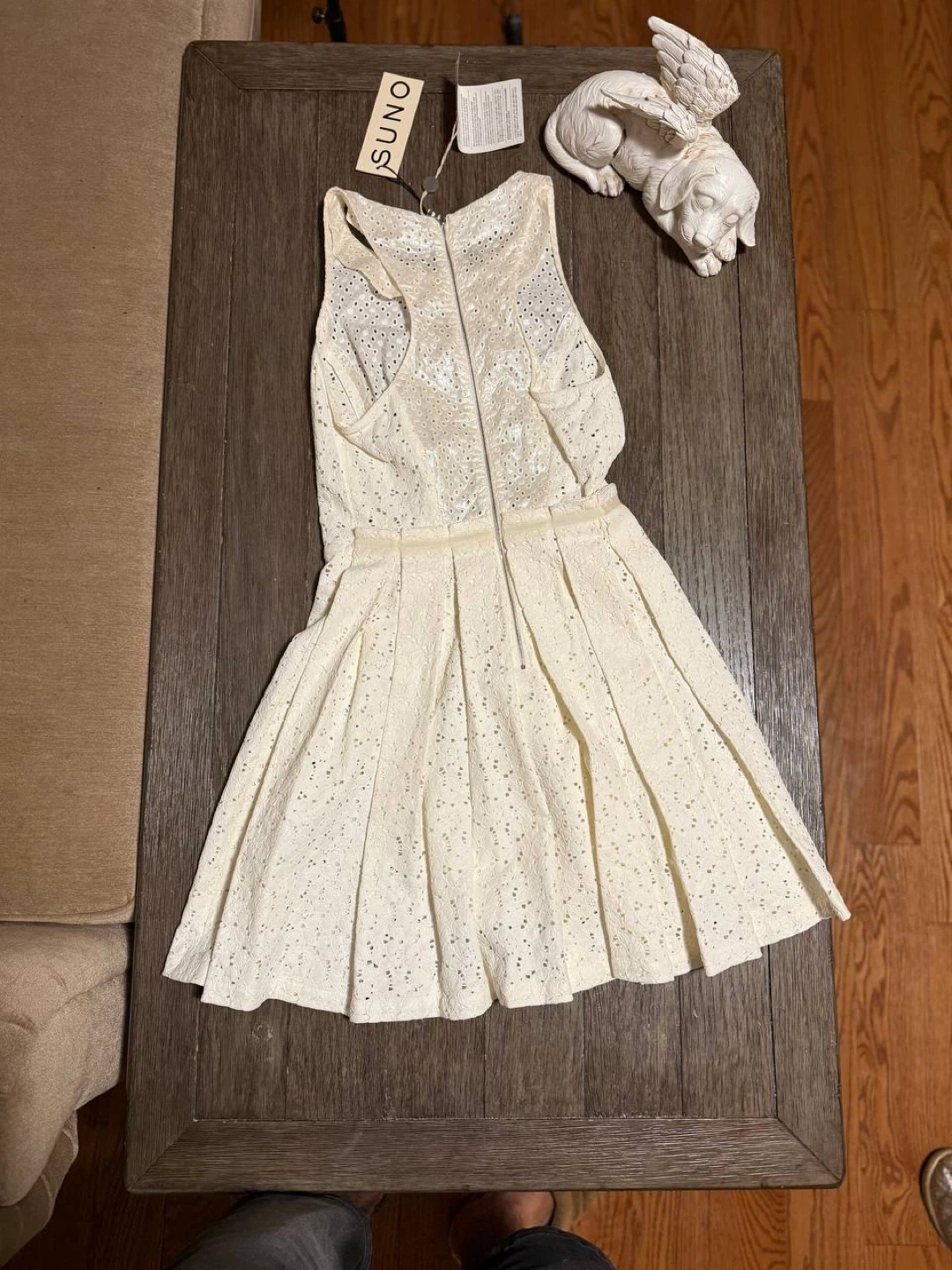Selling a lovely white sleeveless dress from Suno! It features a beautiful eyelet design and a flattering silhouette. Perfect for summer days or special occasions